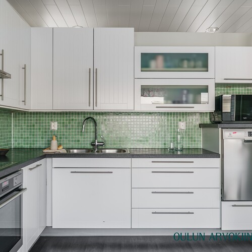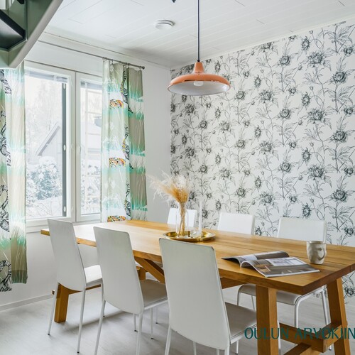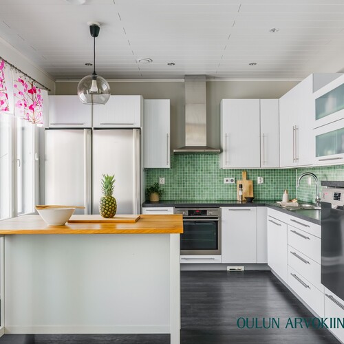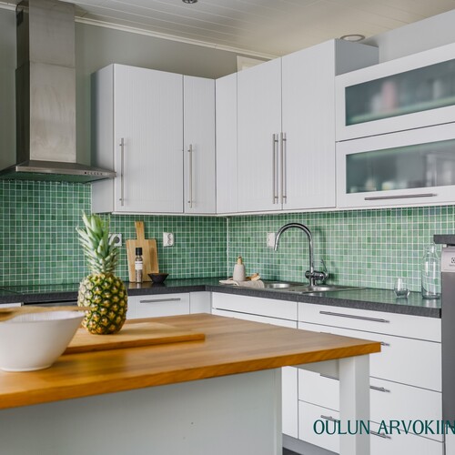 Keittiö on toimiva ja tyylikäs, tarjoten hyvin säilytys- ja työskentelytilaa. Saareke toimii luontevana lisätyötilana ja ruokailutila kokoaa perheen yhteen arjen hetkiin.