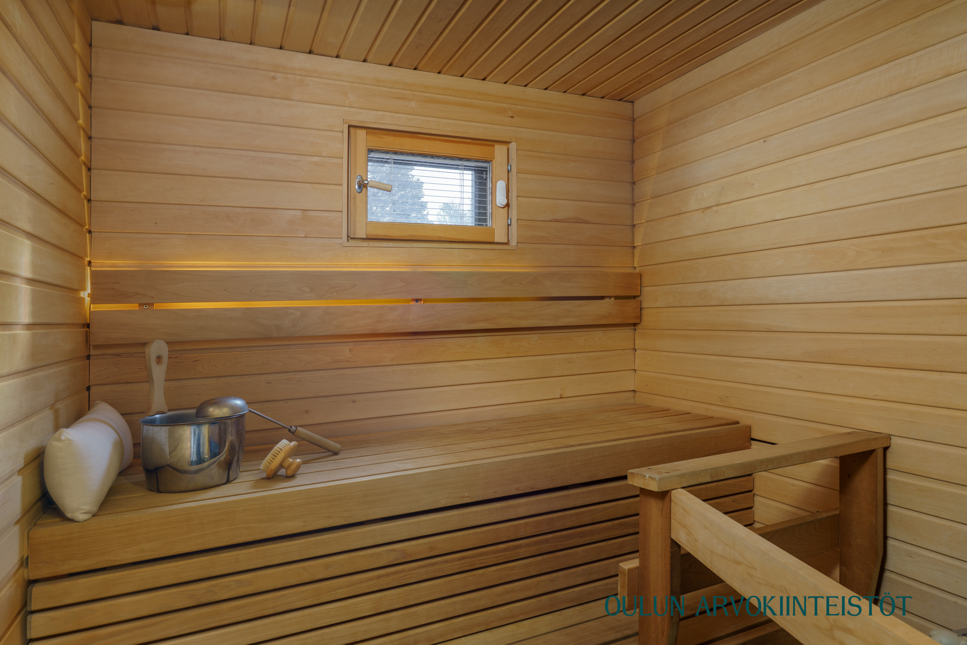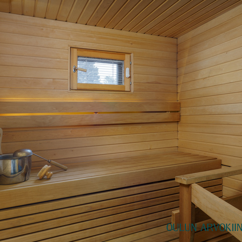 Varusteet: sähkökiuas, lattialämmitys, LED-valaistus, ikkuna ulos