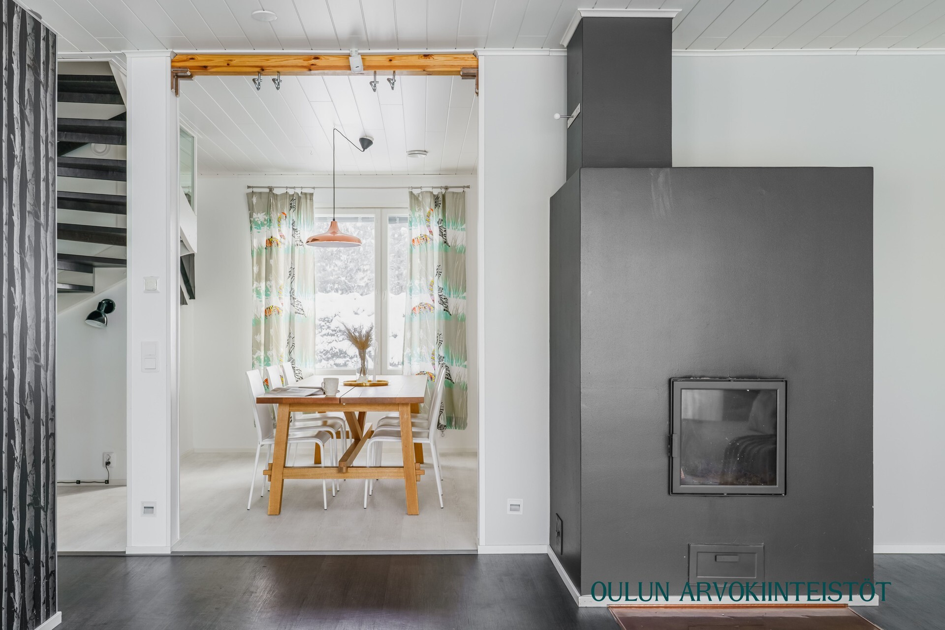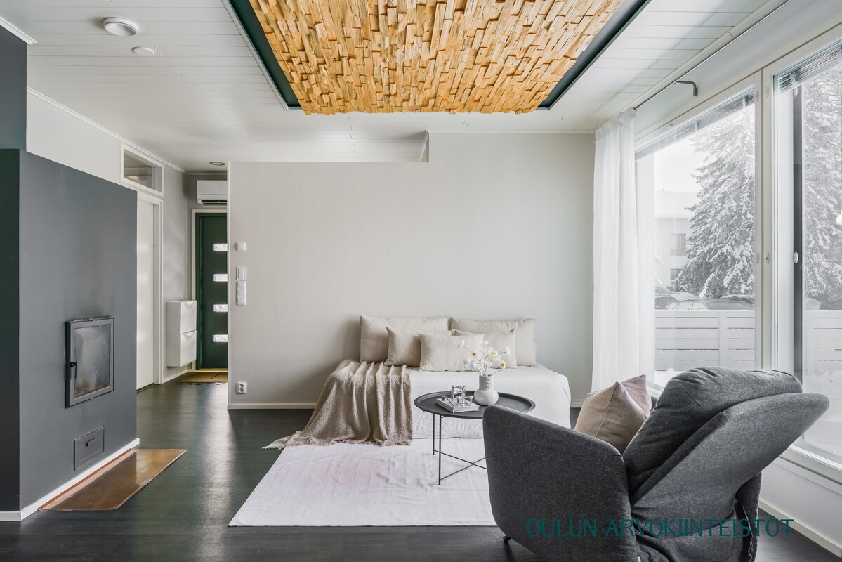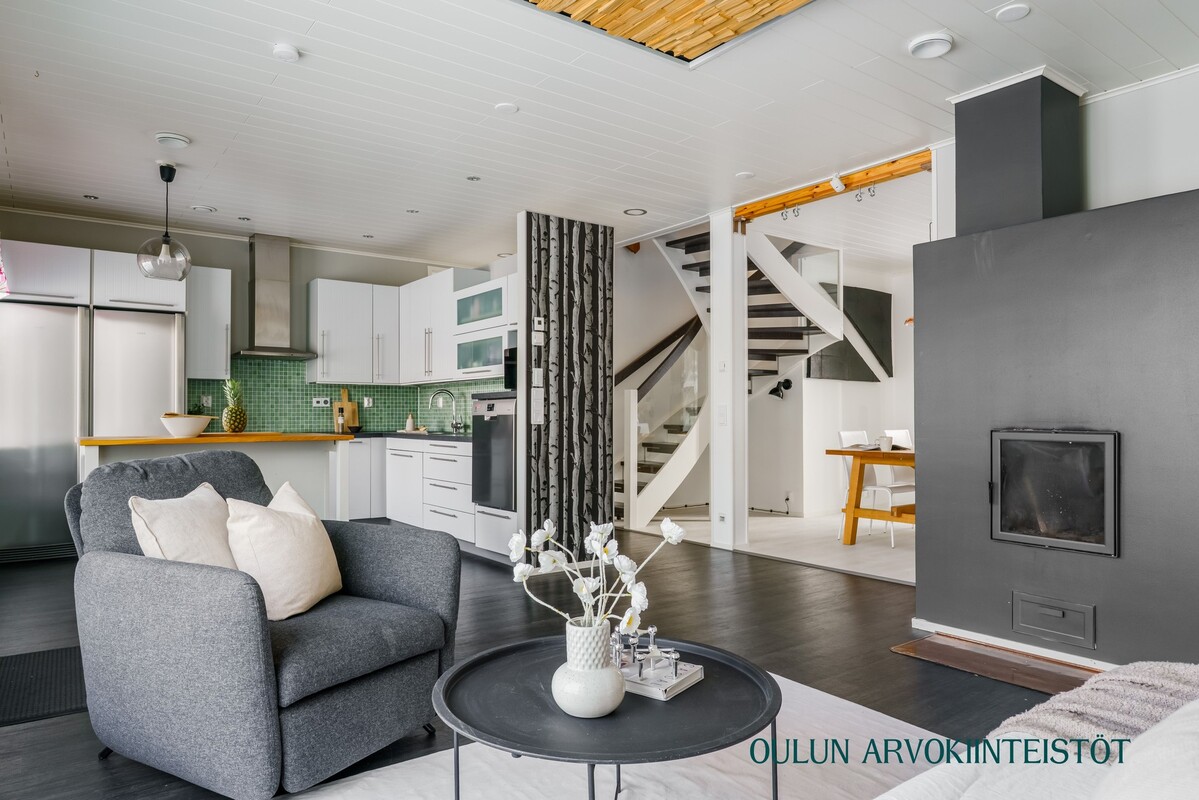 Kodissa on asuinpinta-alaa 140,70 m² ja tilat on suunniteltu käytännöllisesti. Alakerran avara oleskelutila muodostuu olohuoneen, keittiön ja ruokailutilan yhtenäisestä kokonaisuudesta. Suuret ikkunat tuovat tilaan runsaasti luonnonvaloa ja varaava takka luo tunnelmaa sekä tuo lisälämpöä kylmempiin vuodenaikoihin.