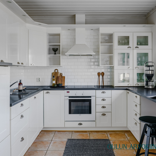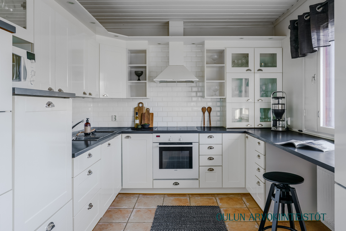 Vaalea ja toimiva U-mallinen keittiö tarjoaa hyvin säilytys- ja työtilaa. Ikkunat tuovat runsaasti valoa, ja ruokailutila sijoittuu luontevasti keittiön yhteyteen.