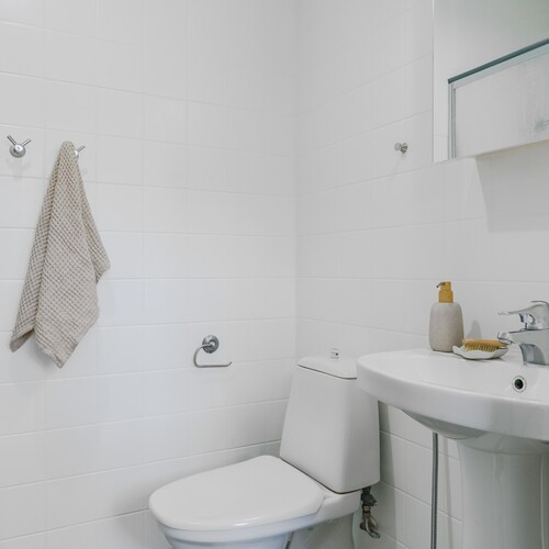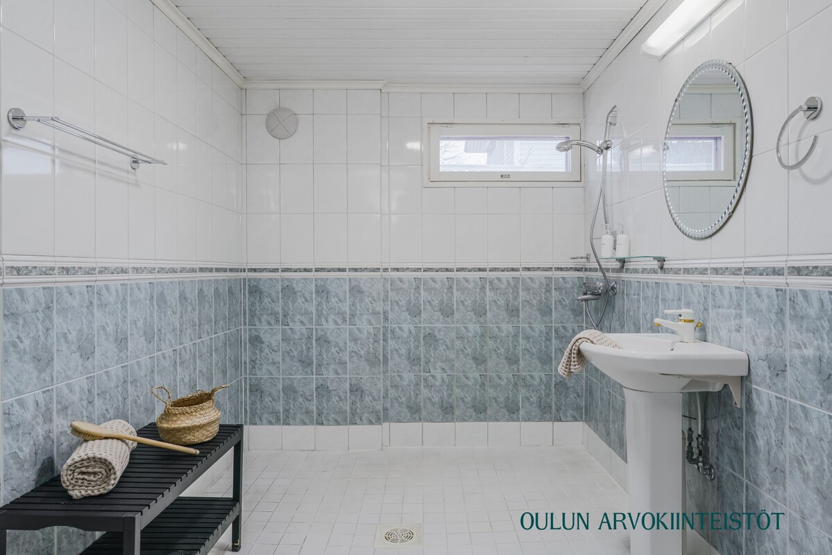 Tilava kylpyhuone tarjoaa hyvin tilaa arjen toiminnoille. Vaalea laatoitus yhdistettynä hillittyihin sävyihin luo rauhallisen ja siistin ilmeen. Selkeä pohjaratkaisu tekee tilasta käytännöllisen, ja oma ikkuna tuo luonnonvaloa sekä lisää viihtyisyyttä.