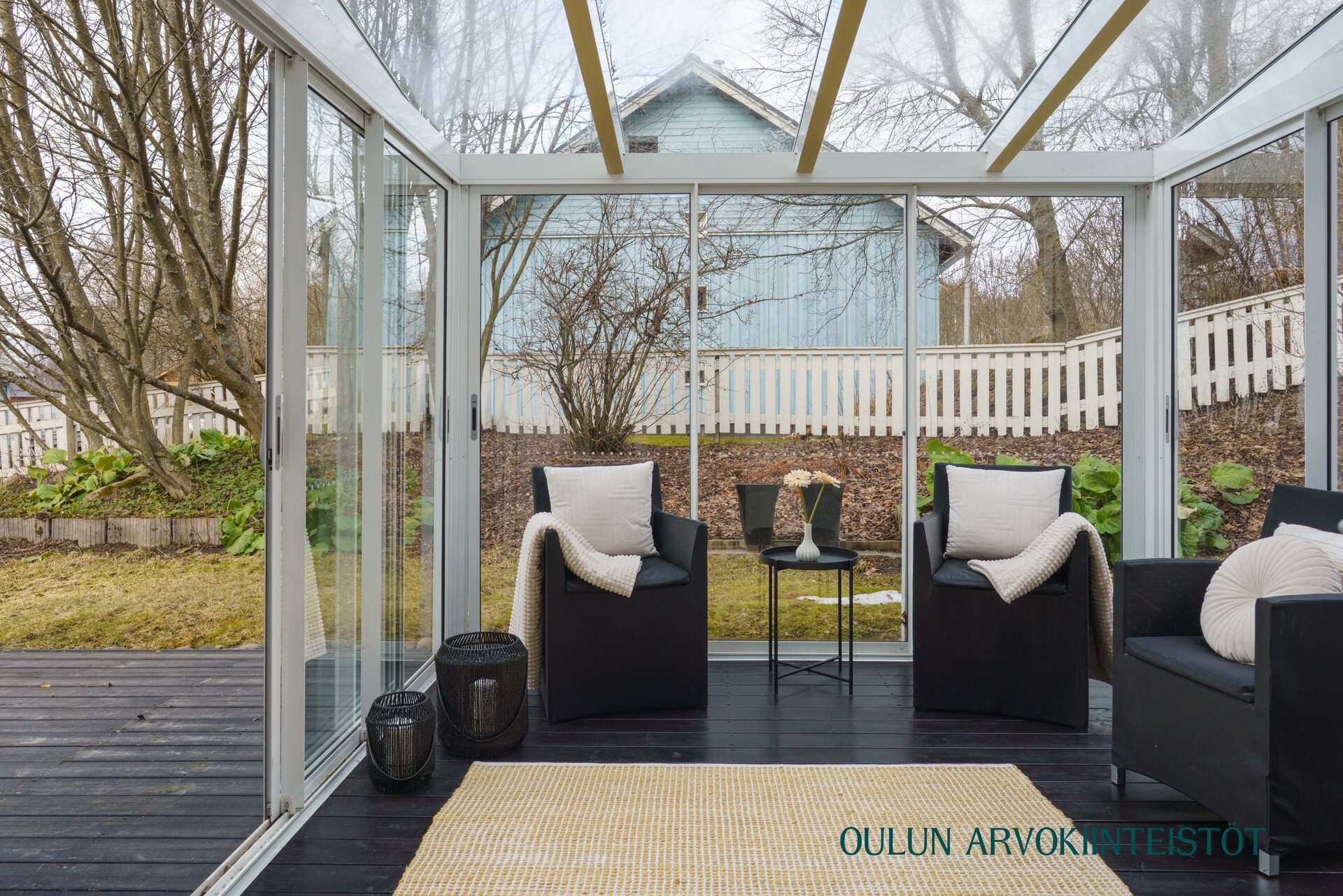 Lasitettu terassi toimii upeana lisäoleskelutilana aikaisesta keväästä pitkälle syksyyn. Valoisa ja suojaisa tila avautuu vehreälle pihalle ja liukuovet yhdistävät sisä- ja ulkotilan luontevasti. Terassille käynti takkahuoneesta.