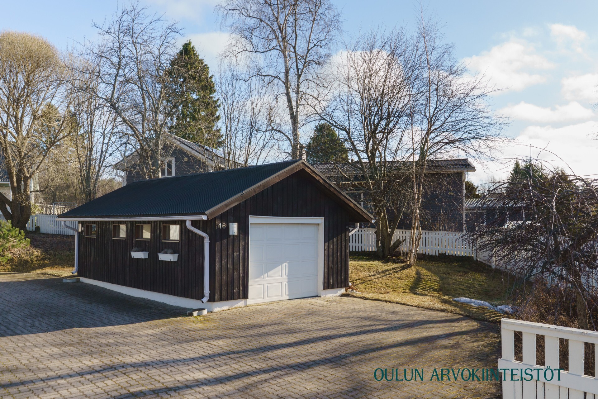 Eristetty autotalli/varastorakennus viimeistelee kokonaisuuden.