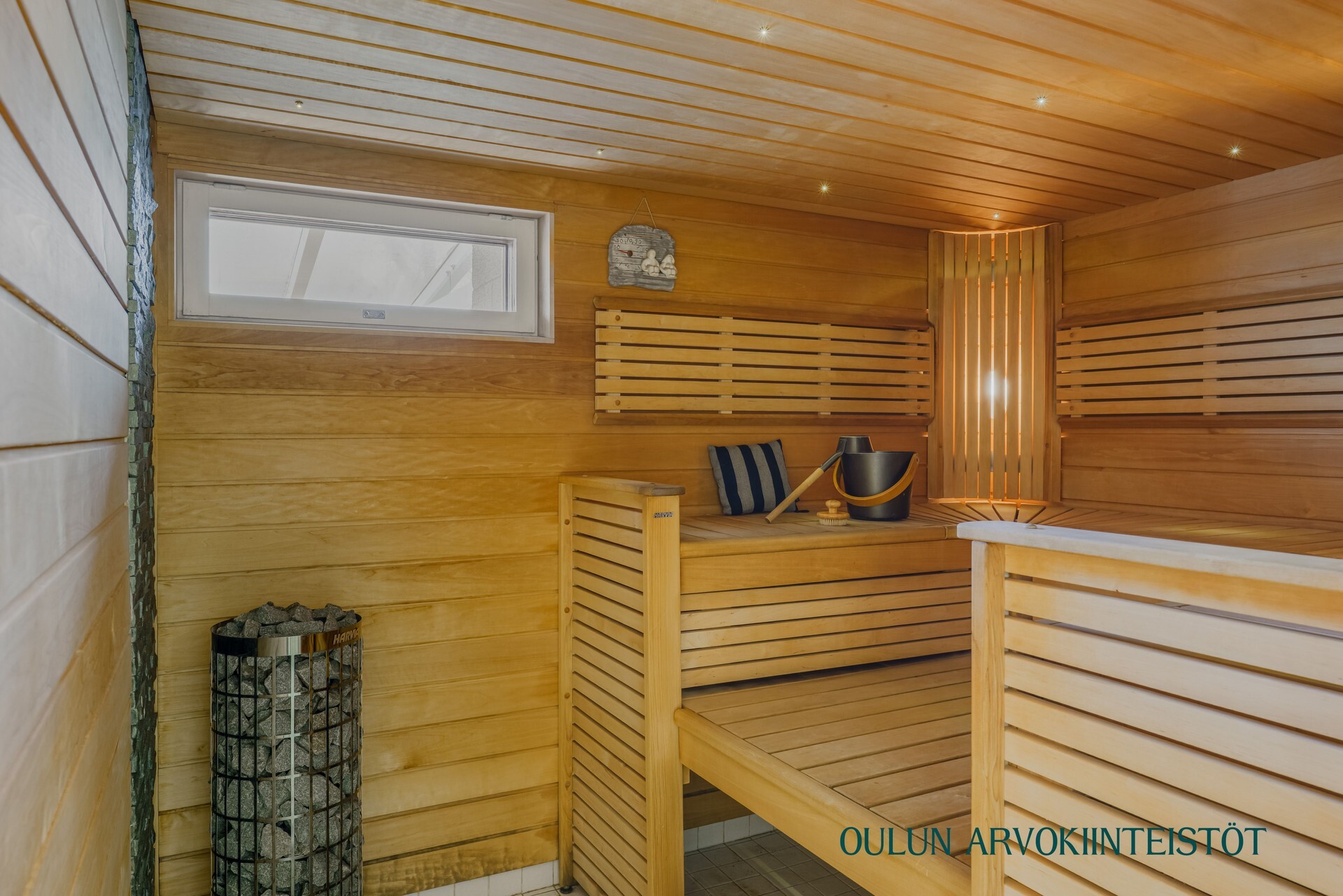 Varusteet: sähkökiuas, lattialämmitys, valokuituvalaistus, ikkuna ulos