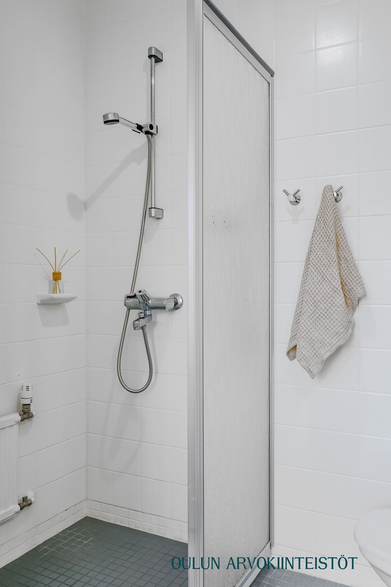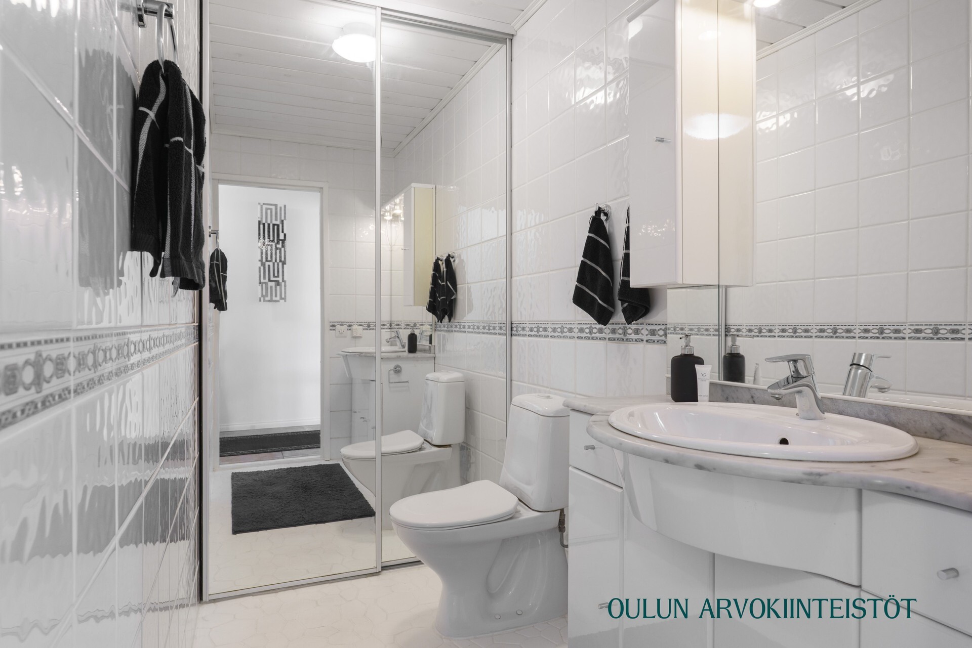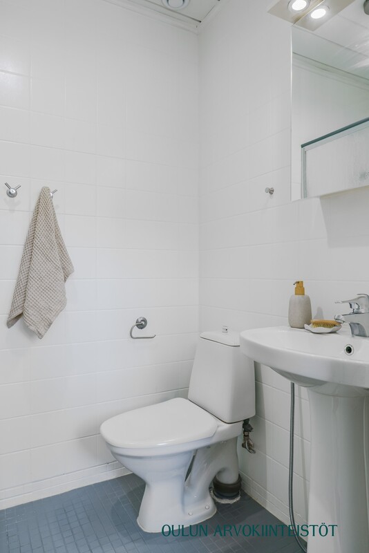 Varusteet: lattiaan asennettu WC, bidee, lattialämmitys, lattiakaivo, suihku, suihkuseinä, peilikaappi