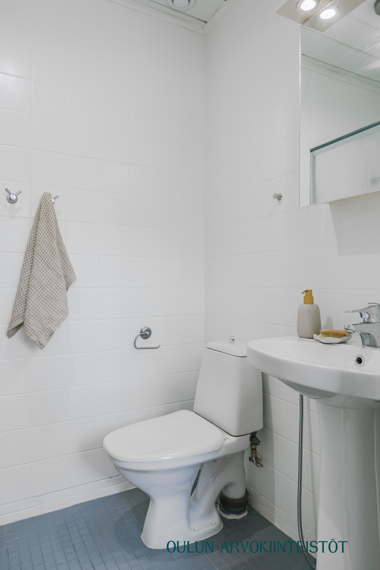 Varusteet: lattiaan asennettu WC, bidee, lattialämmitys, peili, allaskaappi
