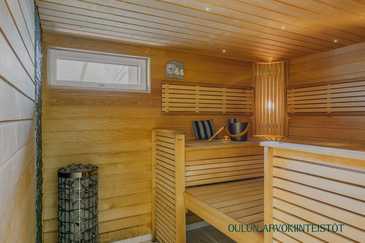 Edustava saunaosasto sekä kodinhoitohuone kylmiöineen viimeistelevät toimivan ja viihtyisän kokonaisuuden.