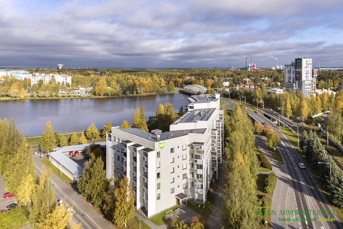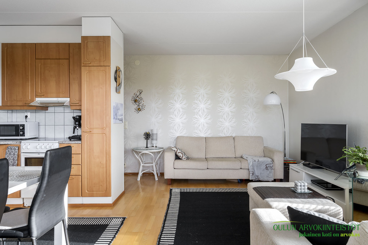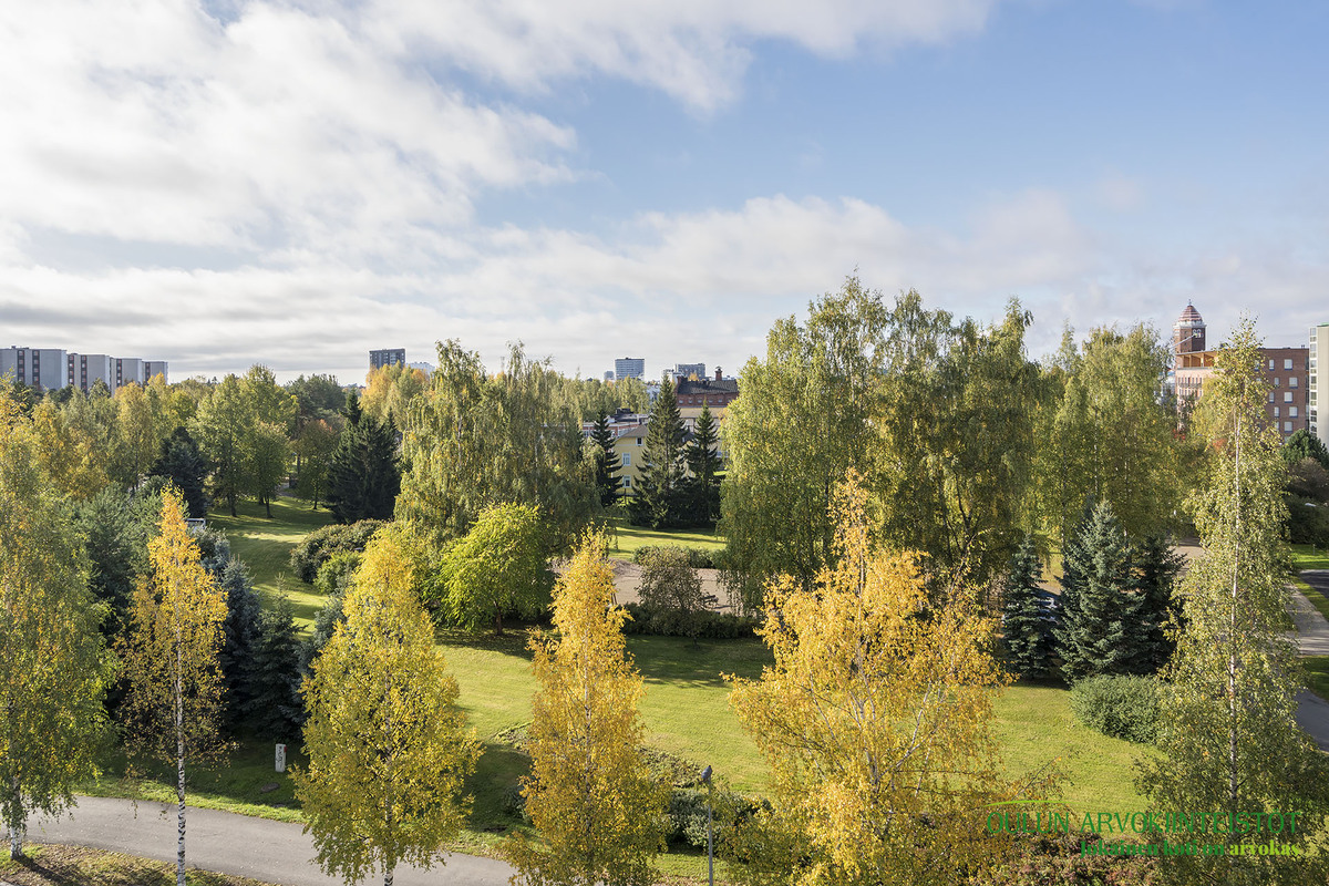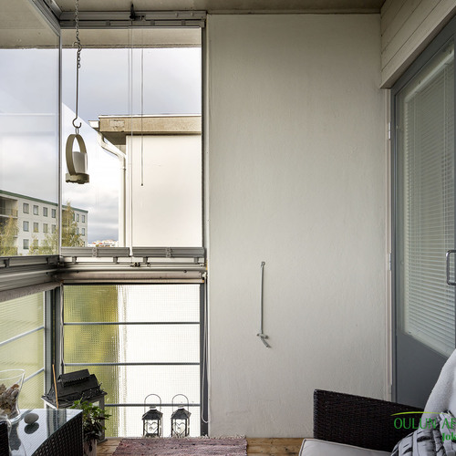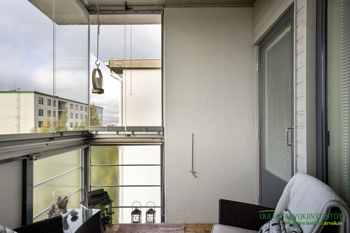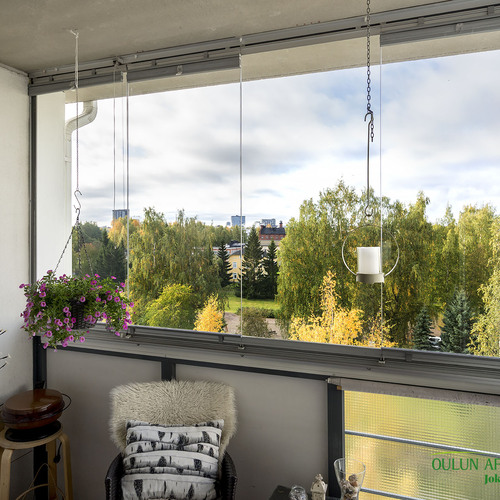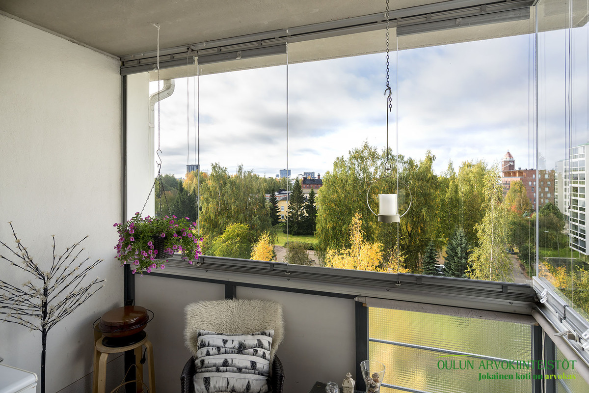 Olohuoneesta on käynti lasitetulle parvekkeelle, josta aukeavat näkymät puistoon ja aina Oulujoen yli. Se on paikka, jossa vuodenajat vaihtuvat kuin maisematauluina – kevään vehreys, kesän kirkkaus, syksyn värit ja talven valo.