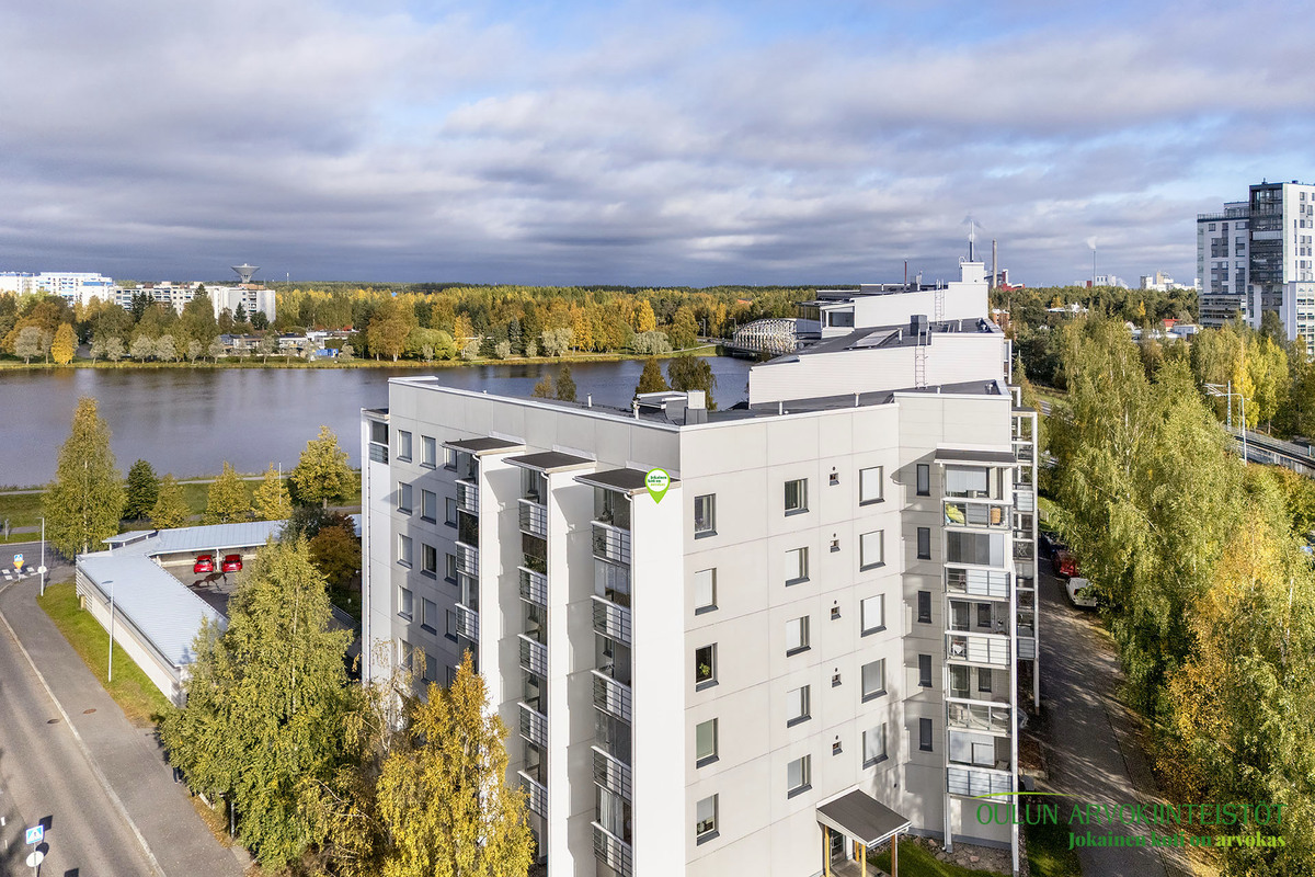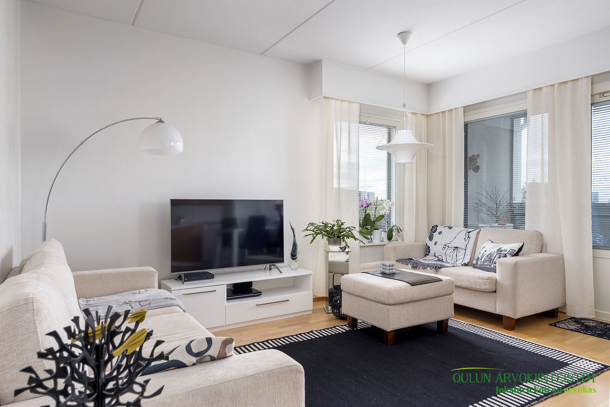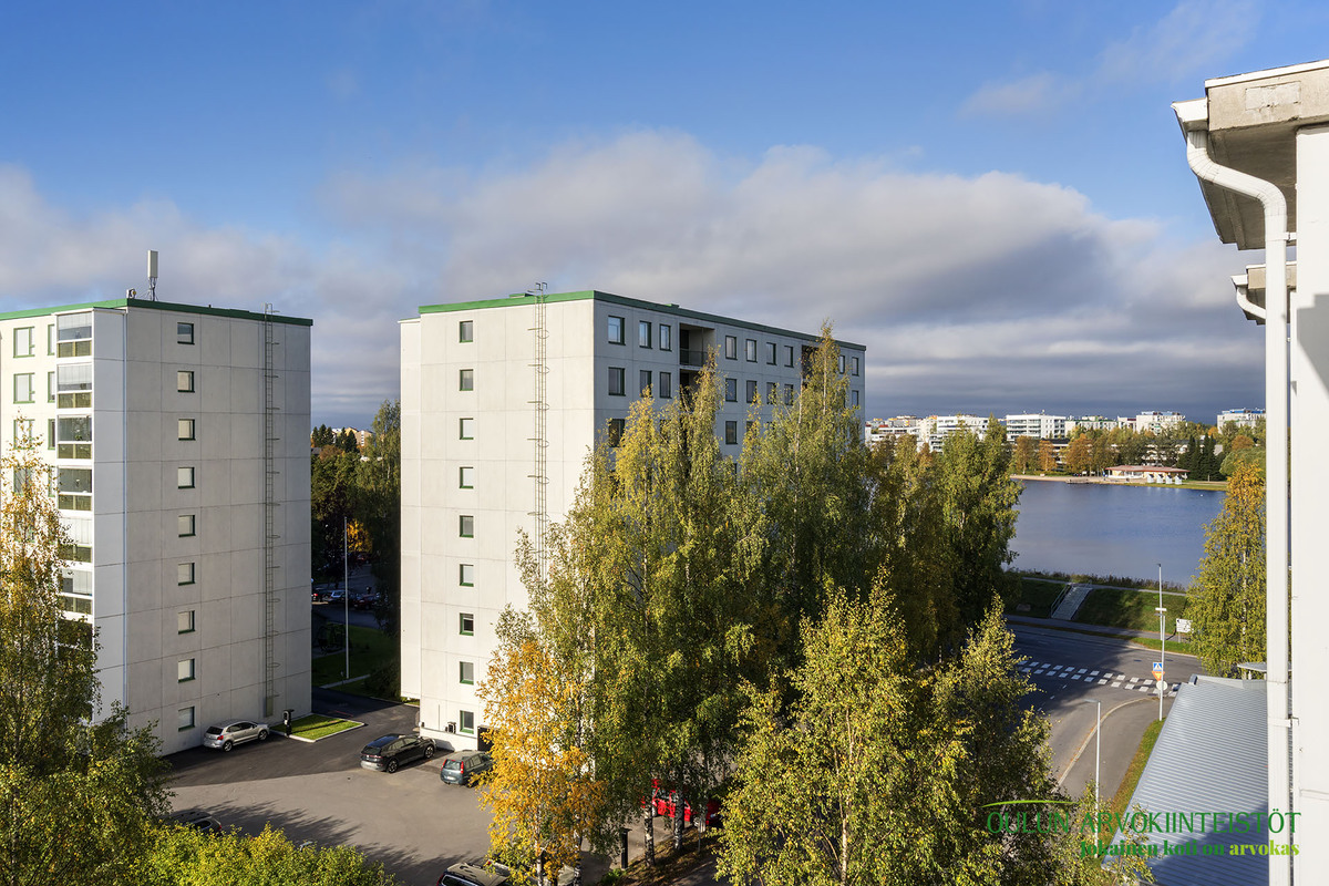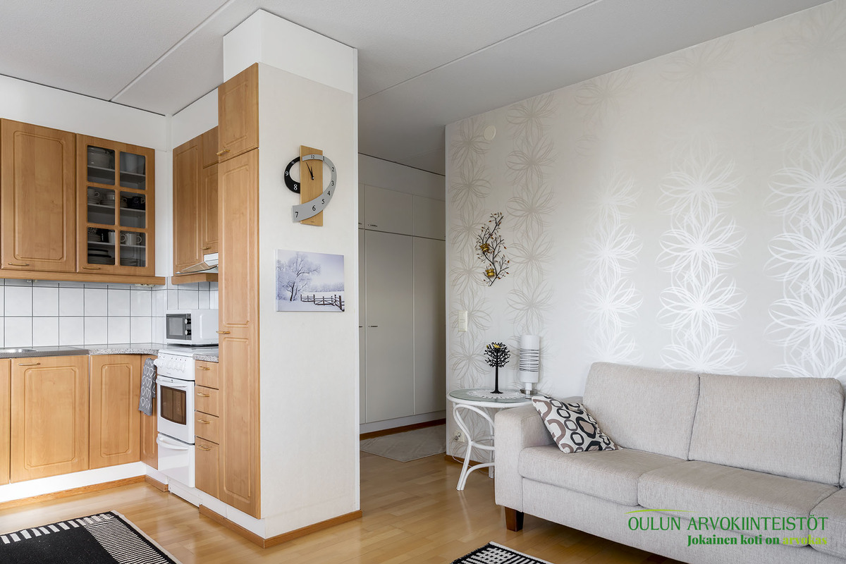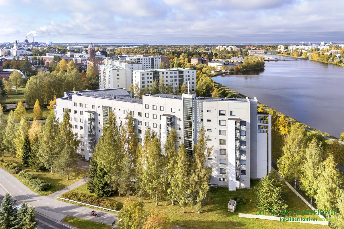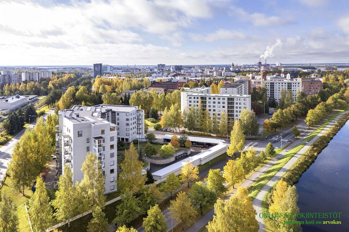 Olohuoneesta on käynti lasitetulle parvekkeelle, josta aukeavat näkymät puistoon ja aina Oulujoen yli. Se on paikka, jossa vuodenajat vaihtuvat kuin maisematauluina – kevään vehreys, kesän kirkkaus, syksyn värit ja talven valo.