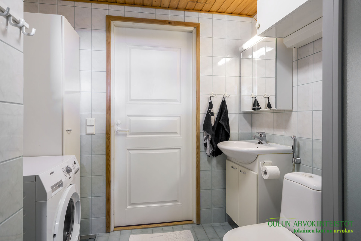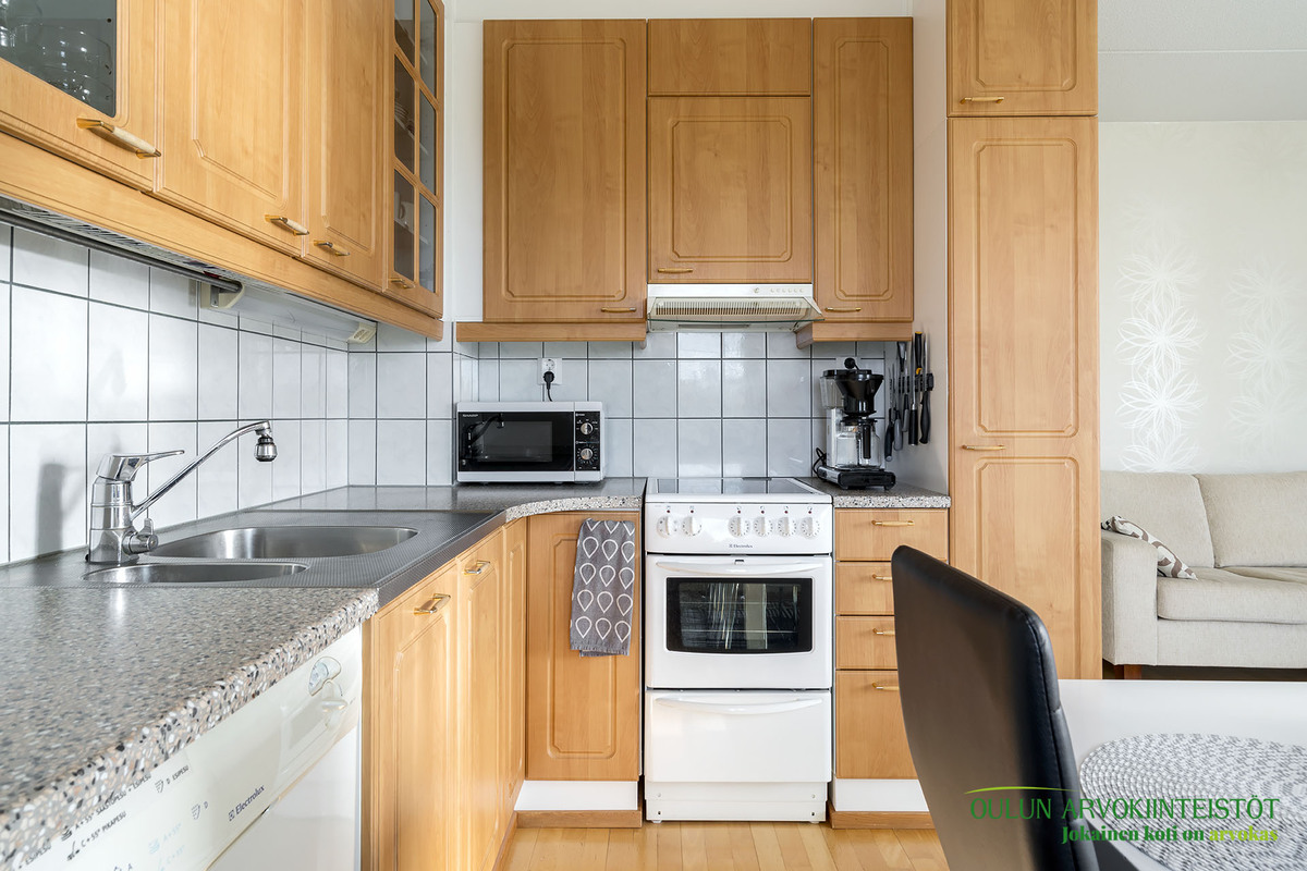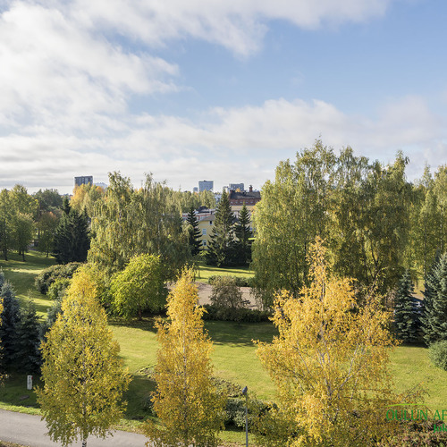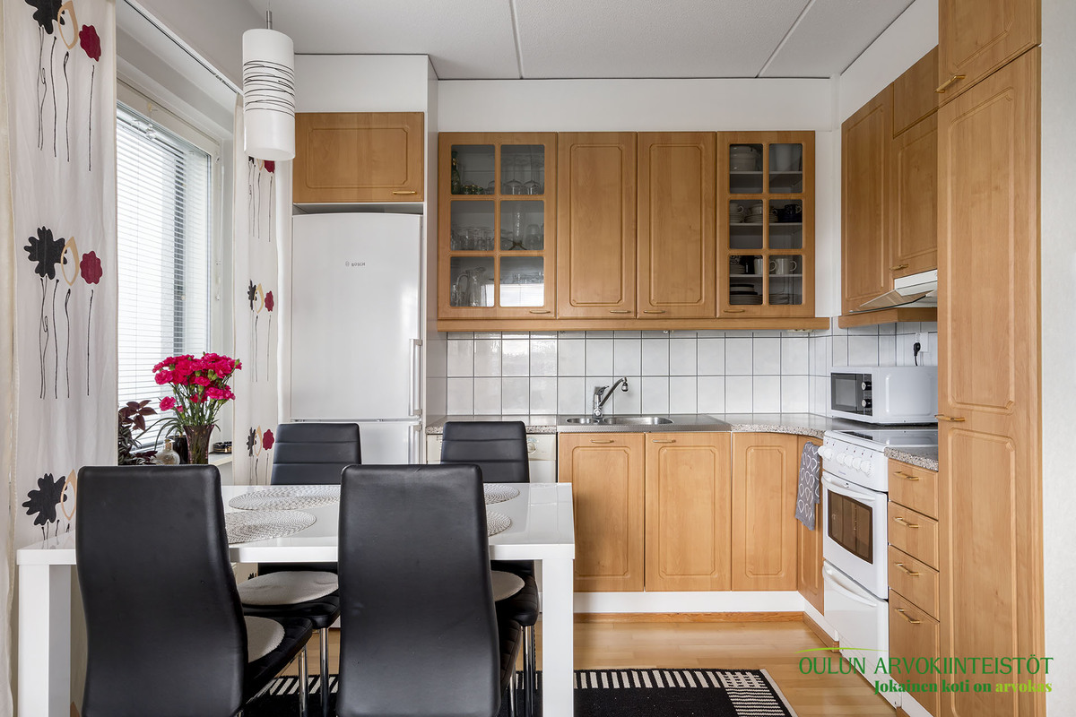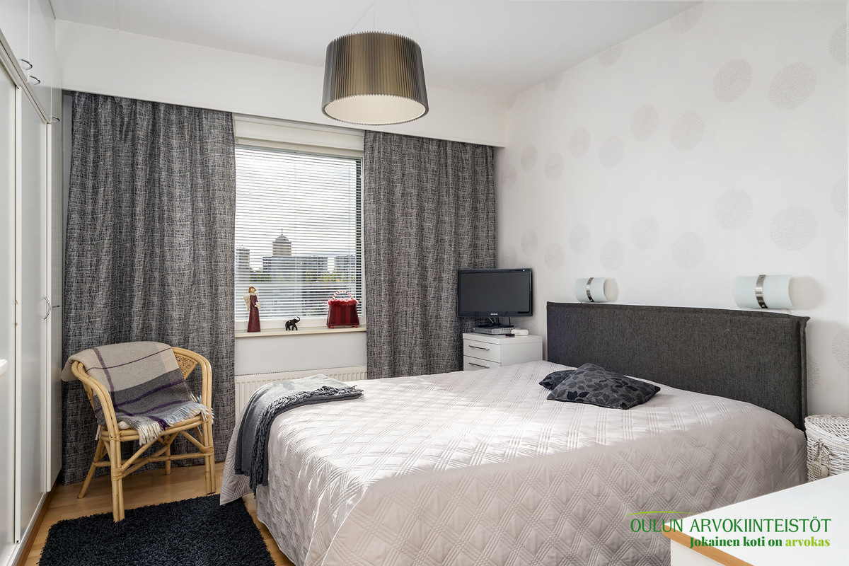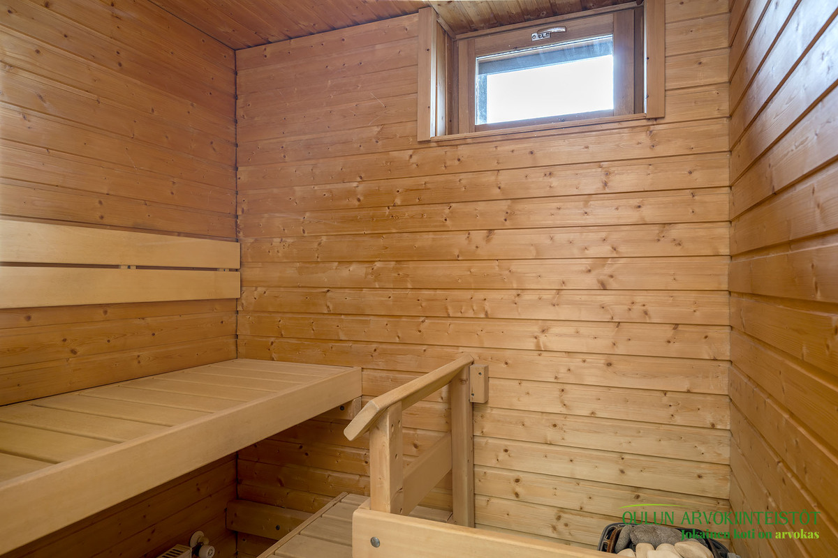 Olohuoneesta on käynti lasitetulle parvekkeelle, josta aukeavat näkymät puistoon ja aina Oulujoen yli. Se on paikka, jossa vuodenajat vaihtuvat kuin maisematauluina – kevään vehreys, kesän kirkkaus, syksyn värit ja talven valo.