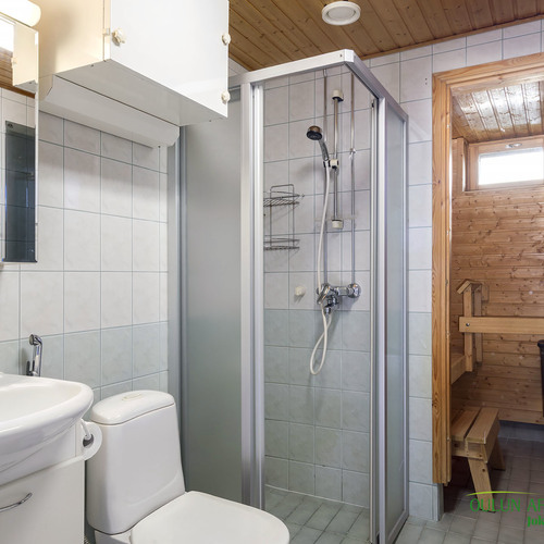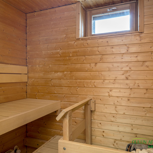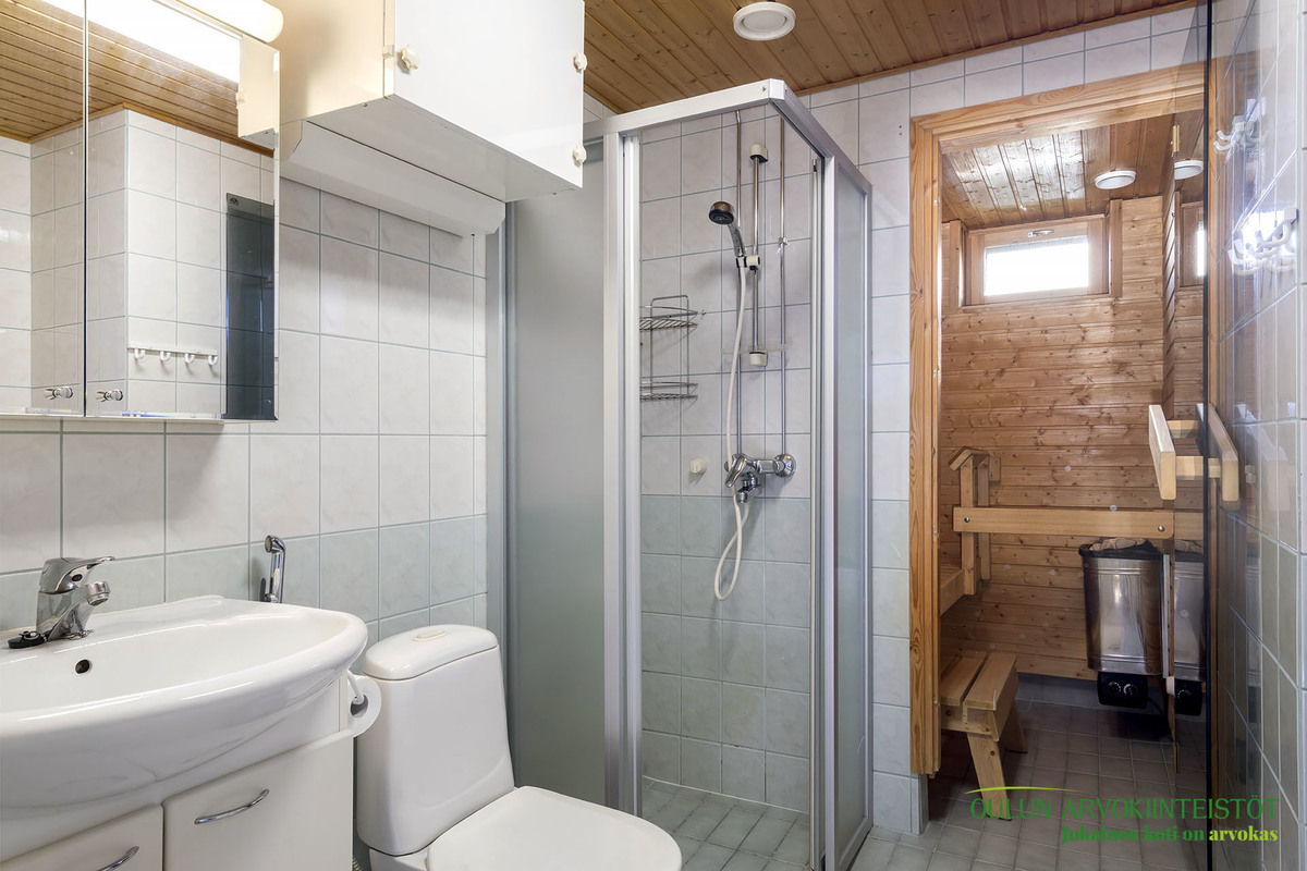 Kylpyhuone on alkuperäisessä, mutta hyvässä kunnossa ja sen yhteydessä oleva oma sauna tarjoaa juuri sopivan hetken arjen luksusta – omat löylyt silloin kun haluat.