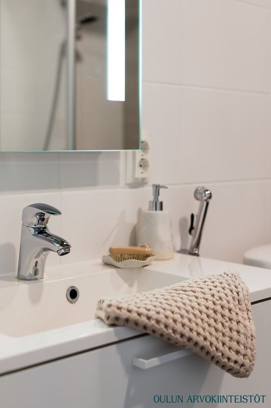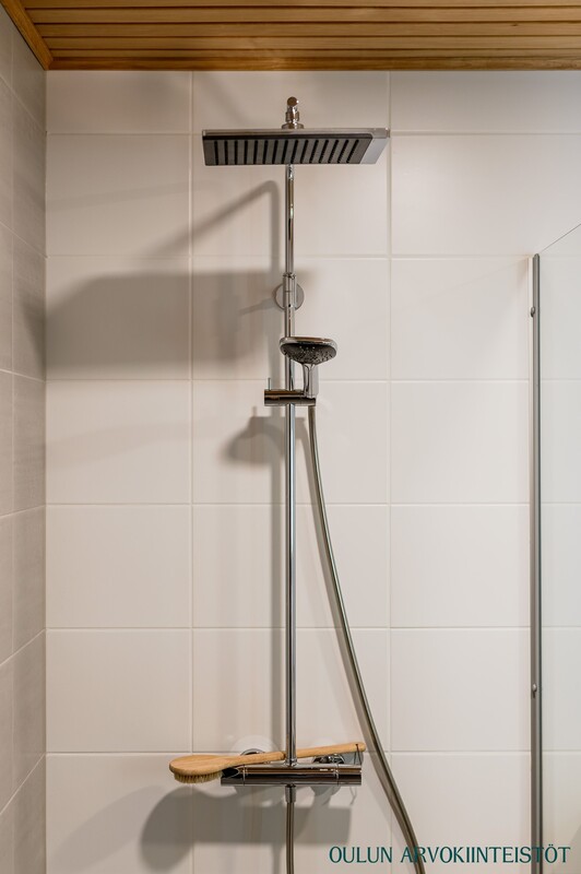 Varusteet: suihku, suihkuseinä, peili, allaskaappi, kiinteät valaisimet, kylpyhuonekaapistot, pesukoneliitäntä, lattialämmitys