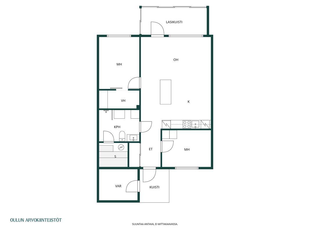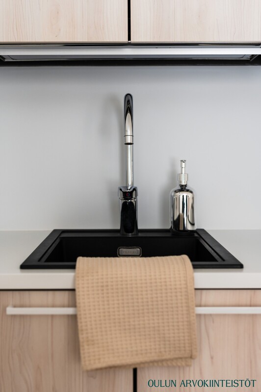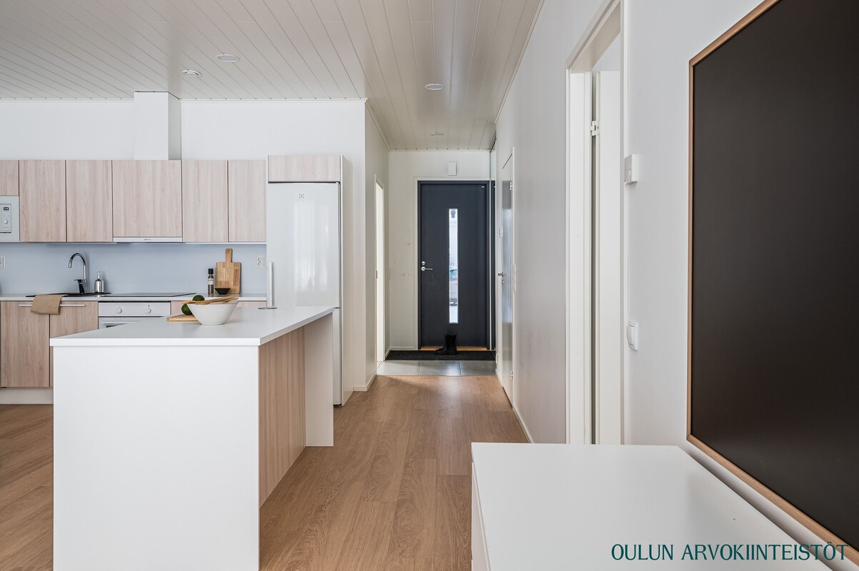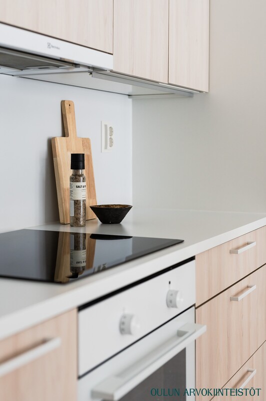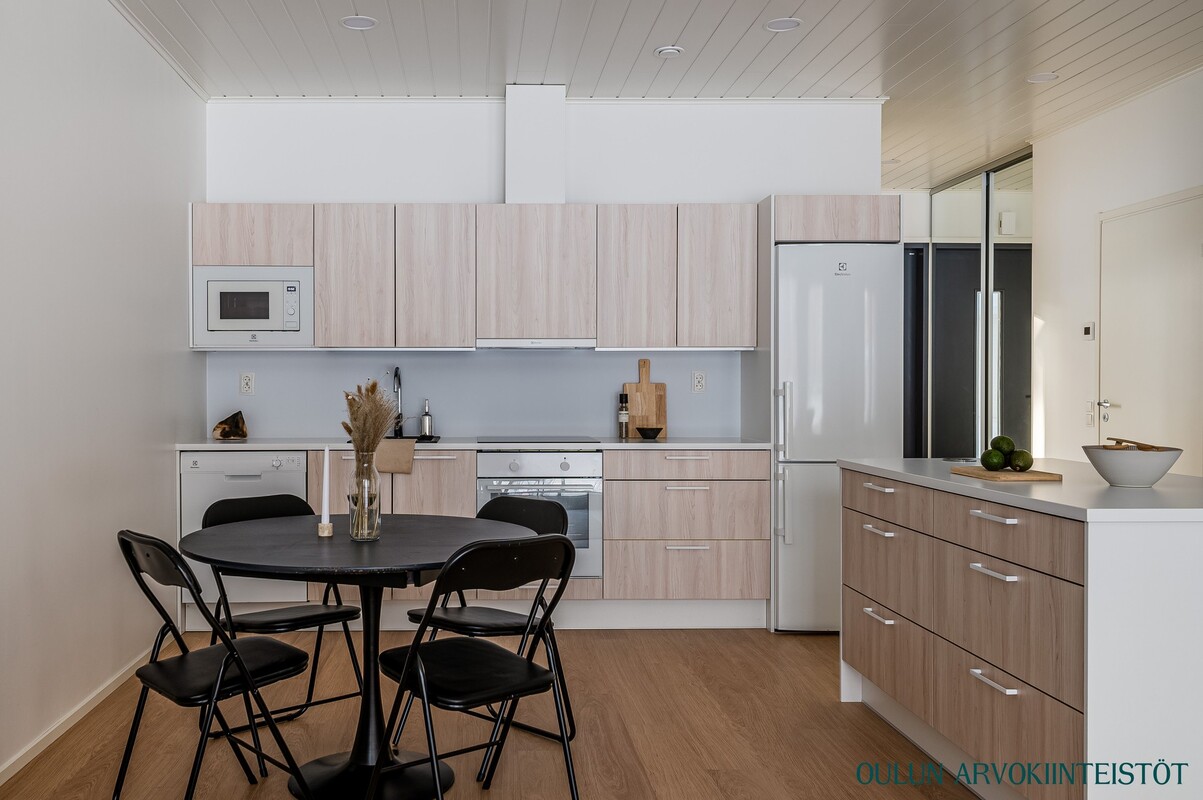 Varusteet: jääkaappipakastin, induktioliesi, erillisuuni, liesituuletin, mikroaaltouuni, astianpesukone, kiinteät valaisimet, integroidut kodinkoneet
