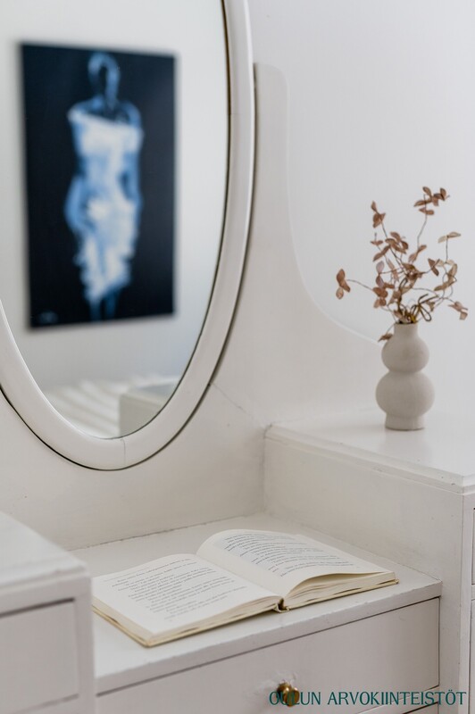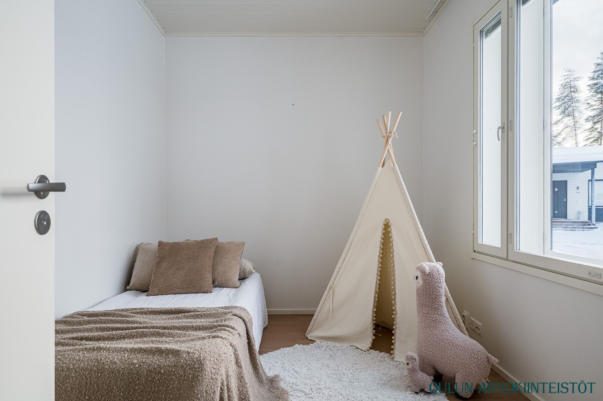 Toinen makuuhuone soveltuu erinomaisesti lastenhuoneeksi, työtilaksi tai vierashuoneeksi. Ikkunat tuovat tilaan kauniisti valoa ja näkymät ympäristöön viimeistelevät miellyttävän kokonaisuuden.