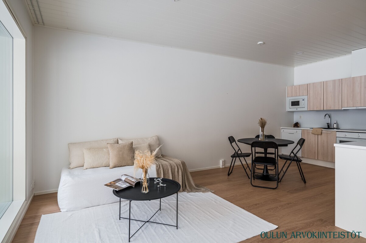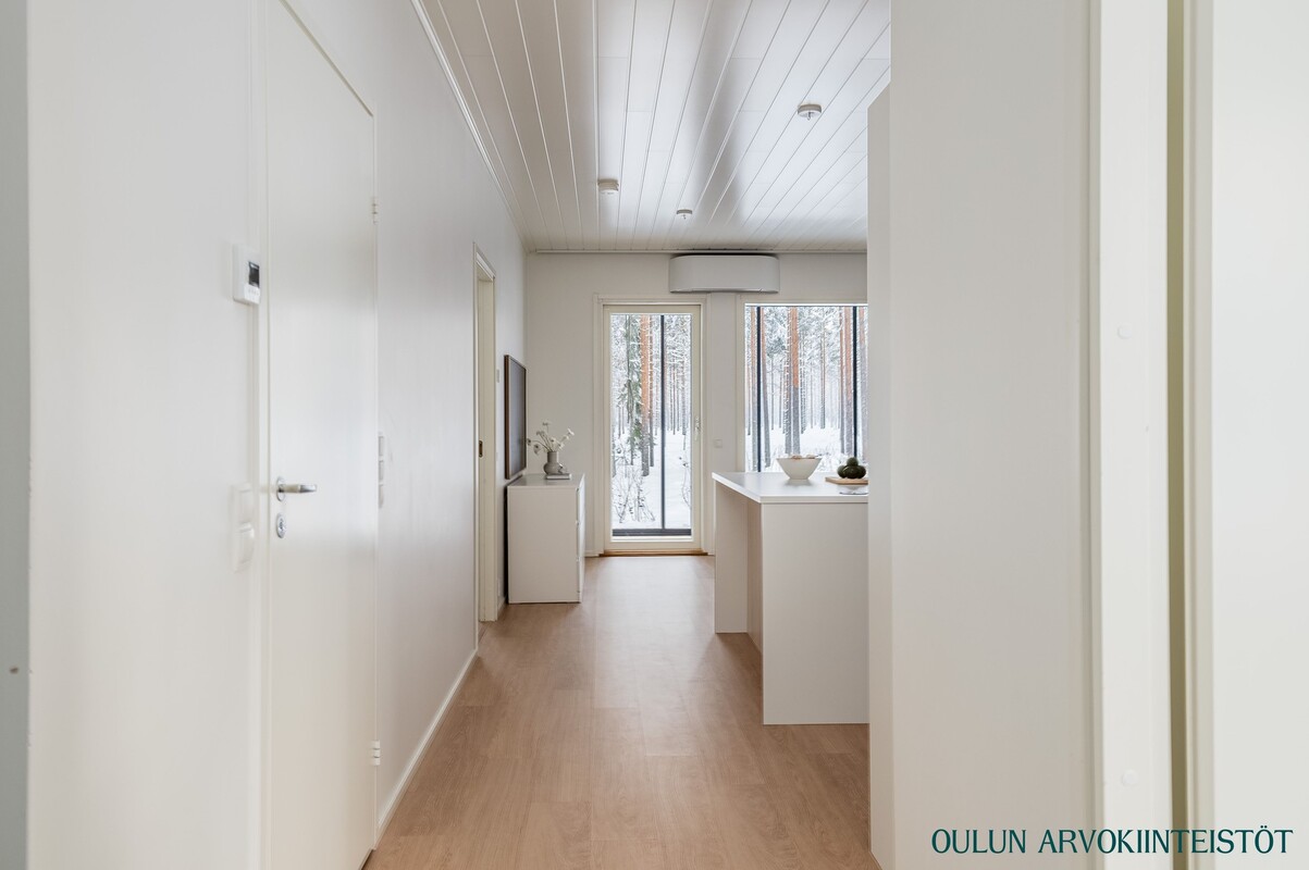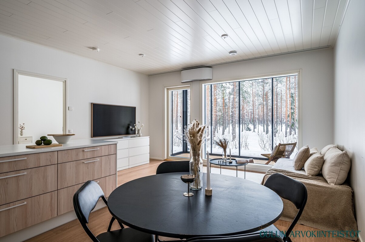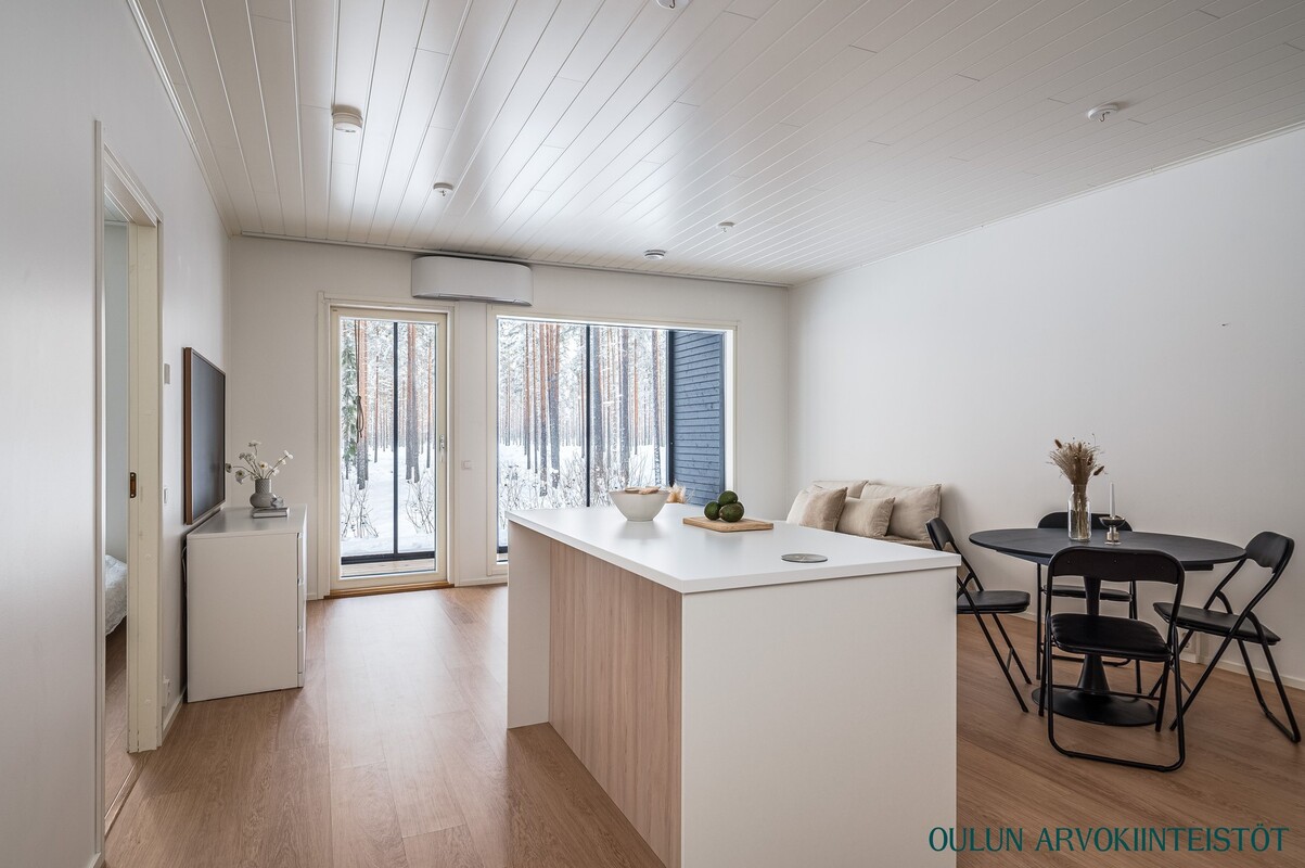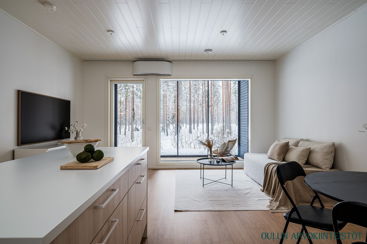 Olohuone ja keittiö muodostavat avaran ja yhtenäisen oleskelutilan. Moderni keittiö saarekkeineen tarjoaa runsaasti työskentely- ja säilytystilaa ja kokonaisuus toimii erinomaisesti niin arjessa kuin vieraiden kestitsemisessä. Oleskelutilasta on kulku lasitetulle terassille, joka toimii viihtyisänä lisähuoneena pitkälle syksyyn. Terassilta avautuu rauhallinen, metsäinen näkymä omalle pihalle.