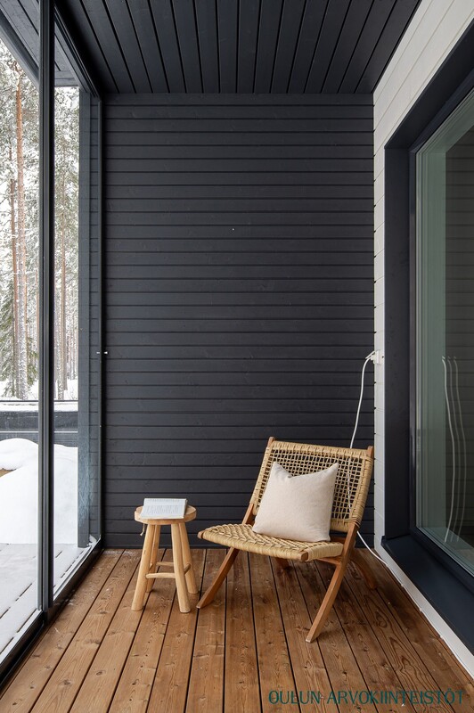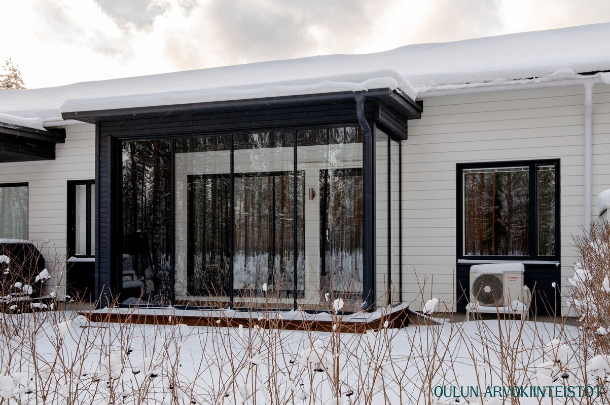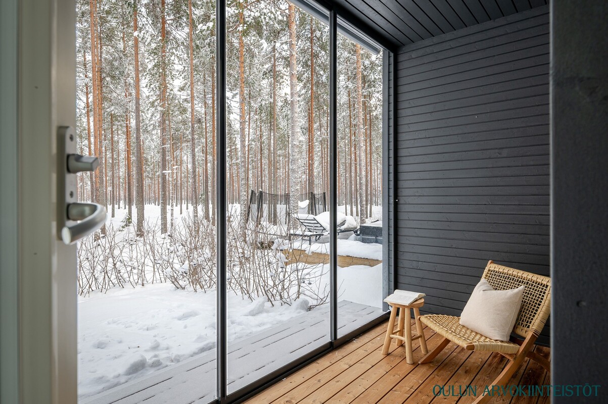 Lasitettu terassi tarjoaa viihtyisän lisätilan ympäri vuoden. Suuret lasipinnat tuovat valoa ja avarat metsäiset näkymät, ja lämminsävyinen puulattia tekee tilasta kutsuvan. Suojaisa piha jatkaa oleskelutilaa luonnon rauhaan.