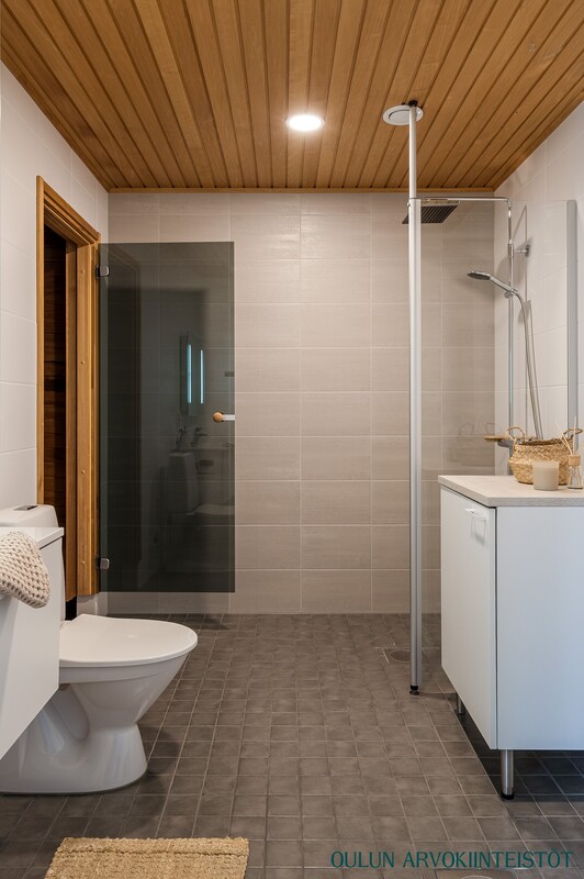 Kylpyhuone on ajattoman tyylikäs ja tilava. Laatoitetut pinnat, modernit kalusteet ja selkeä pohjaratkaisu tekevät tilasta toimivan. Oman saunan lämmin tunnelma kutsuu rentoutumaan päivän päätteeksi.