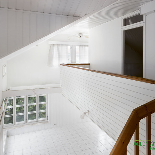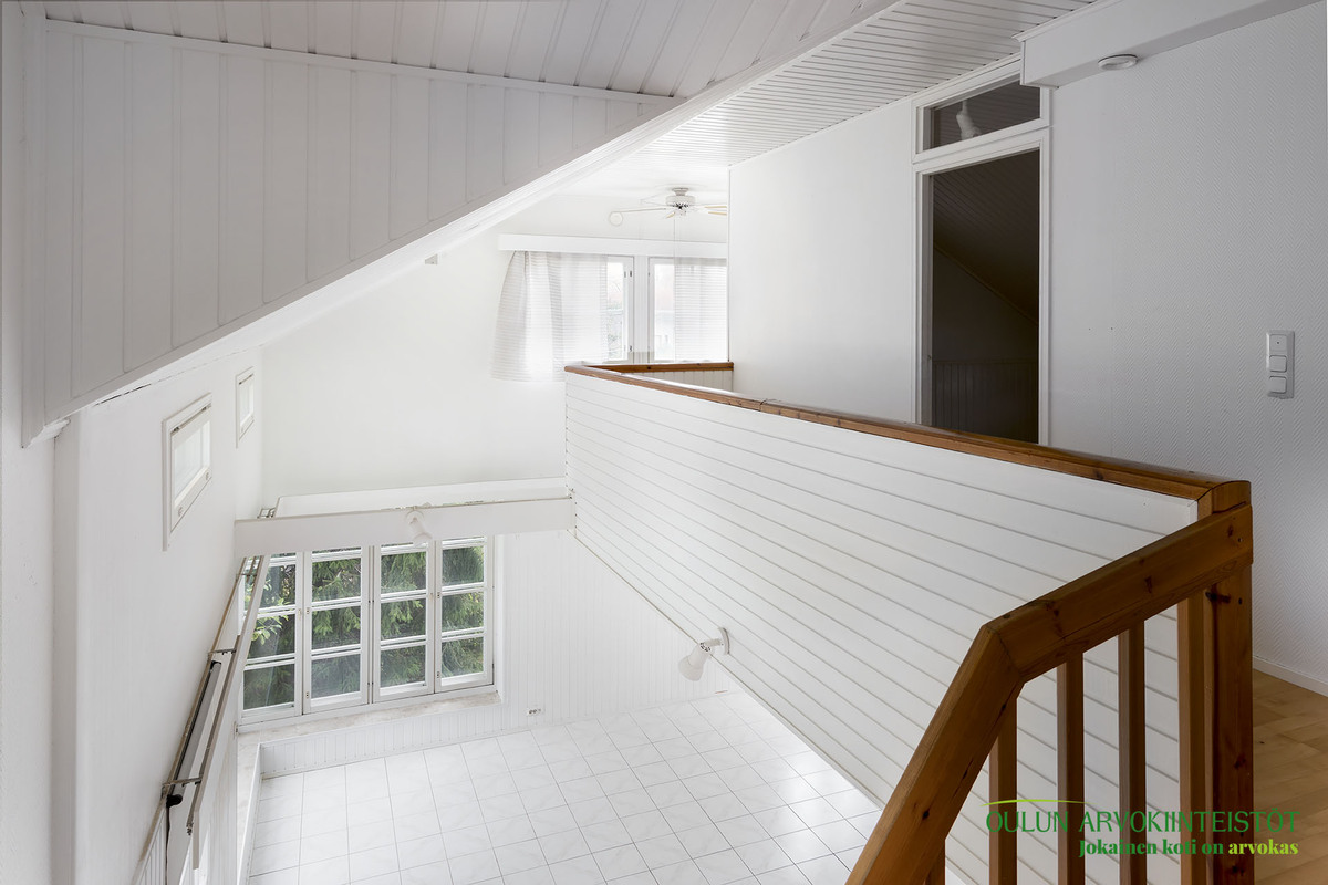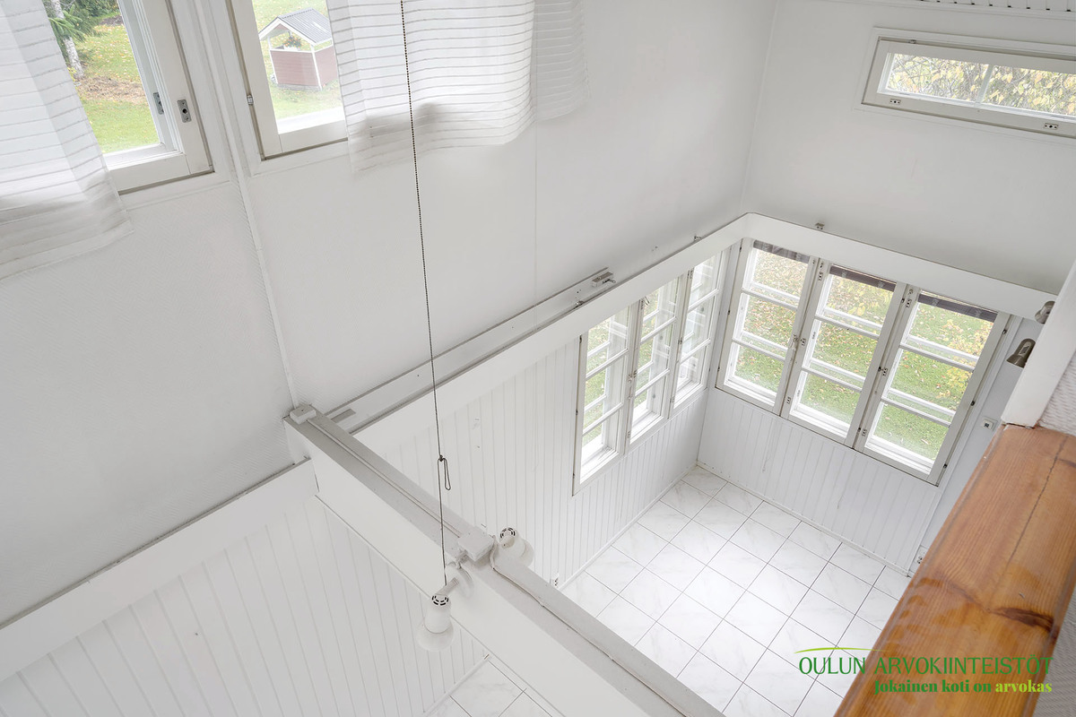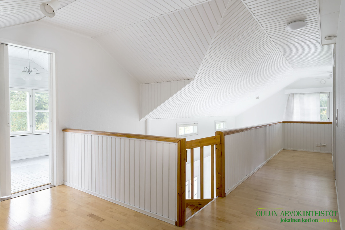 Yläkertaan johtavat portaat on maalattu ja lakattu, ja yläkerrasta löytyy kolme erillistä huonetta, oma kylpyhuone suihkulla sekä tilava vaatehuone. Yläkerran kruunaa suuri parveke, jolta avautuvat näkymät merelle.