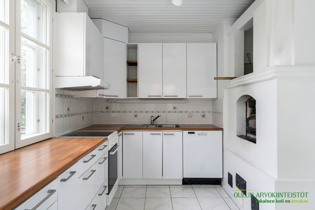 Varusteet: jääkaappi, pakastin, astianpesukoneliitäntä, astianpesukone, keraaminen liesi, liesituuletin hormilla