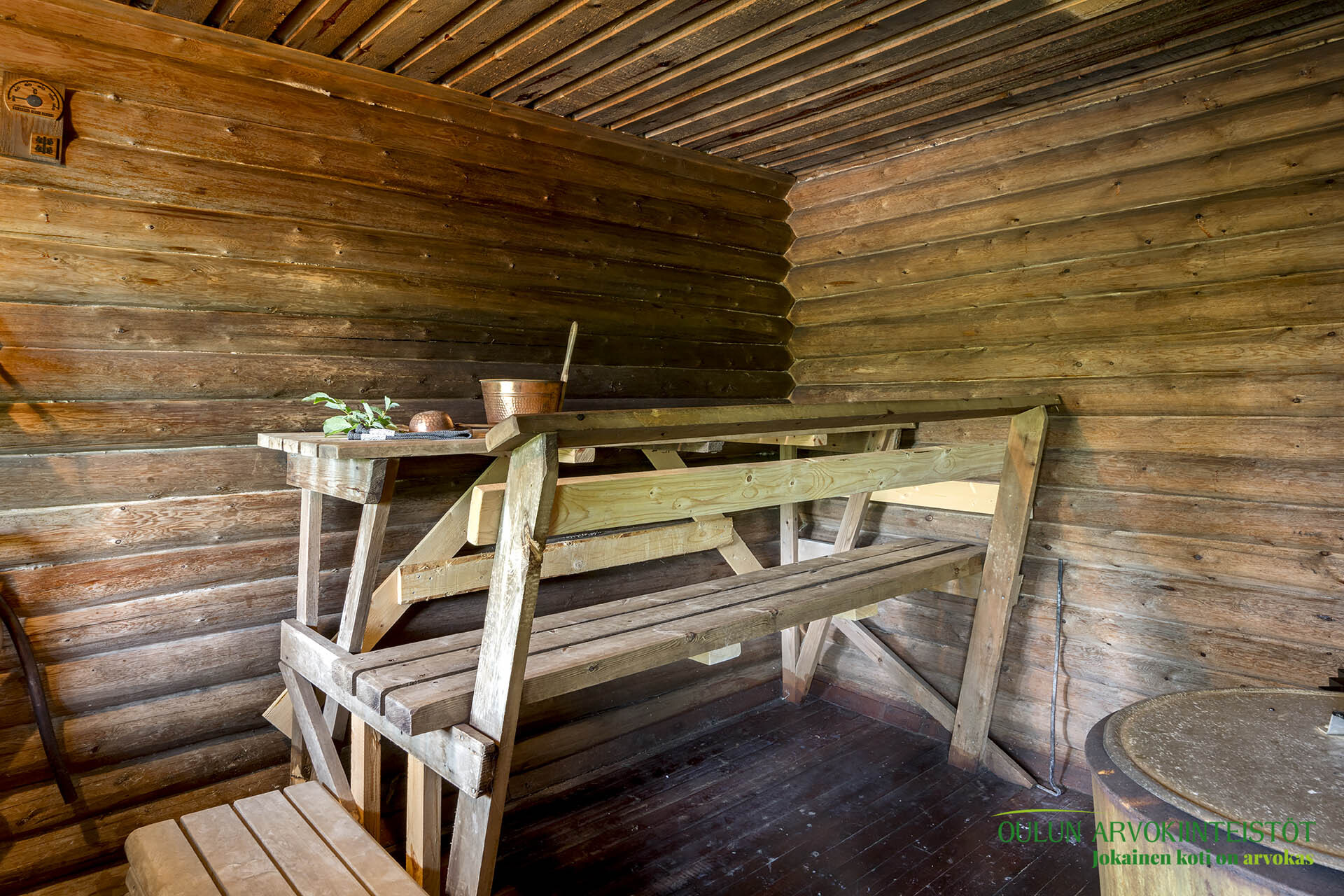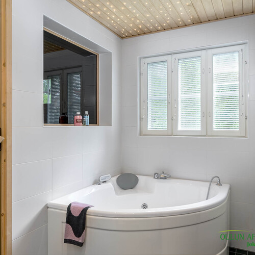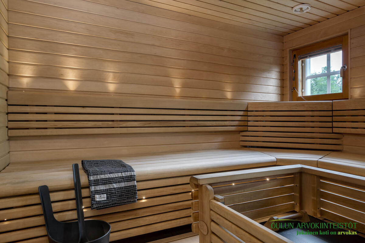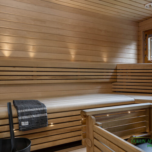 Varustus: Heti valmis -sähkökiuas. Lattia: laatta. Seinät: paneeli.
