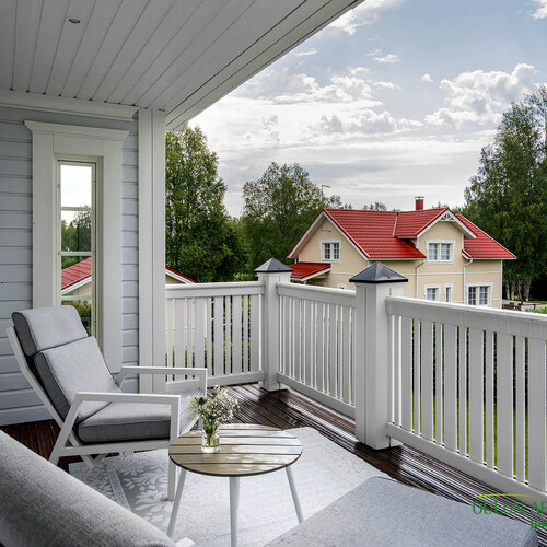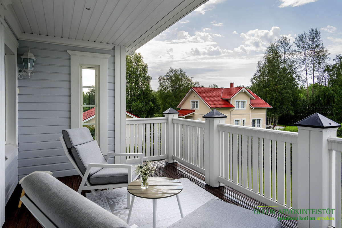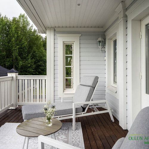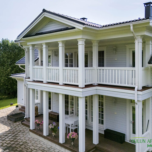 Parvi: Yläkerrassa talon molemmilla puolilla parvekkeet.