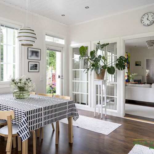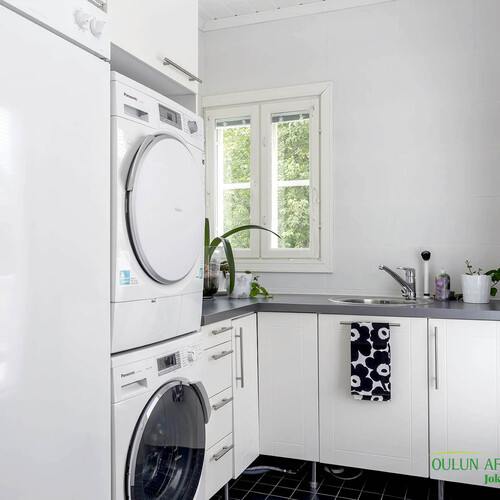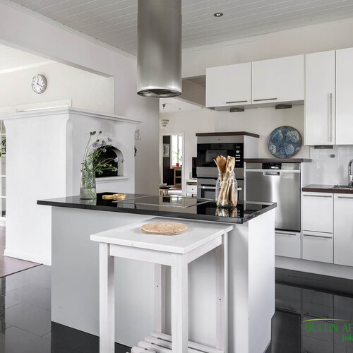 Keittiö on vaaleasävyinen, selkeä ja siisti, varustettu tummilla työtasoilla ja runsaalla säilytystilalla. Se yhdistyy sujuvasti ruokailutilaan, josta avautuu näkymä suoraan joelle päin ja terassille, joka toimii kesäisin lisähuoneena. Terassille on käynti myös takkahuoneesta. Säilytystilaa on runsaasti neljän vaatehuoneen ansiosta sekä wc-tiloja kodista löytyy kolme.