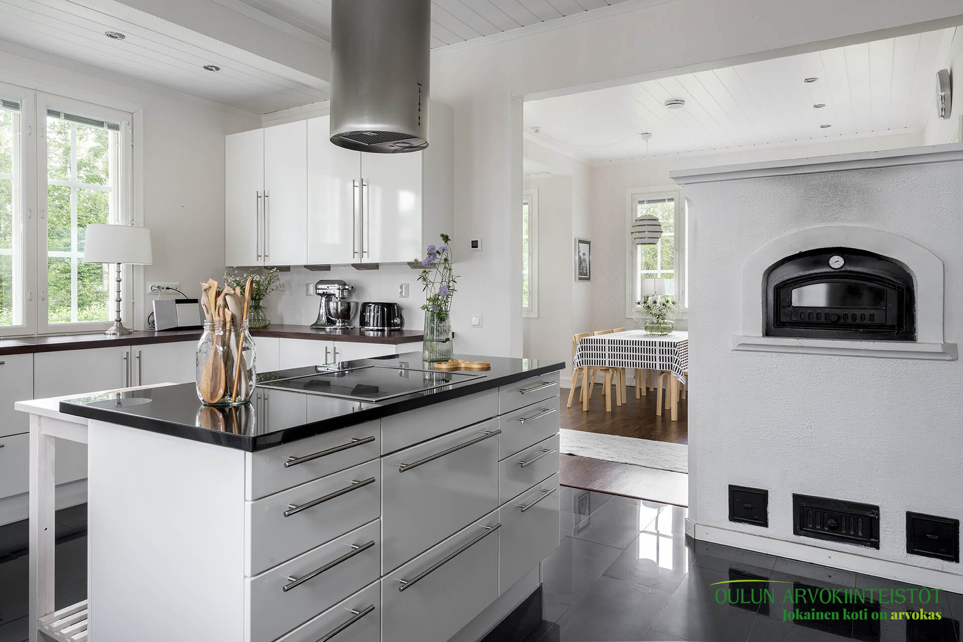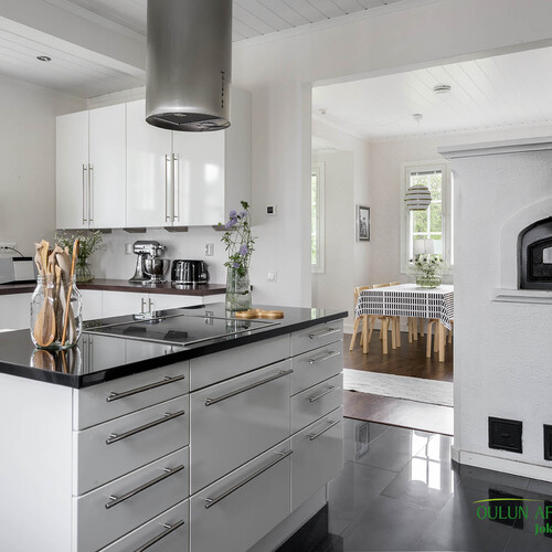 Keittiössä leivinuuni ja takkahuoneessa varaava takka.
