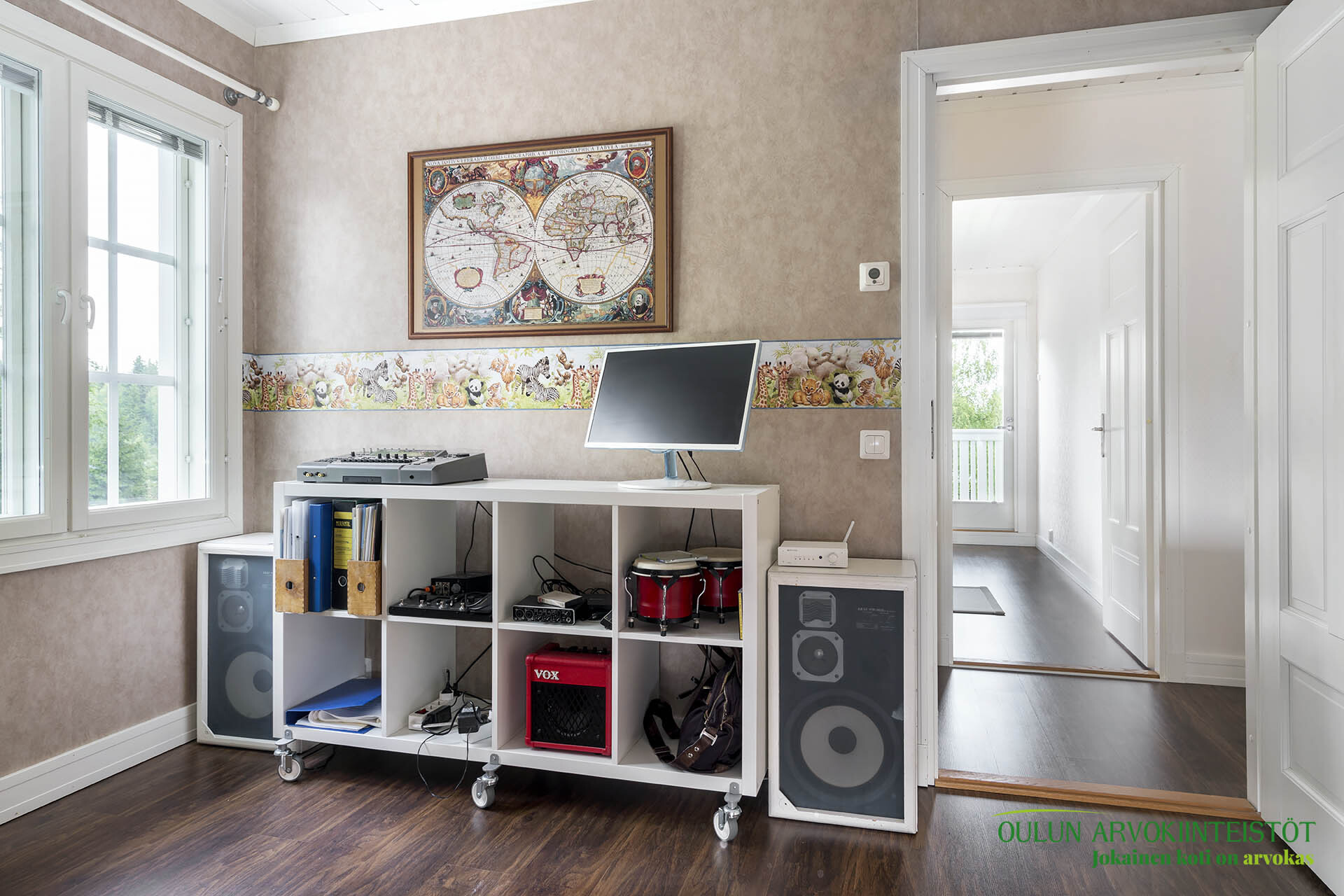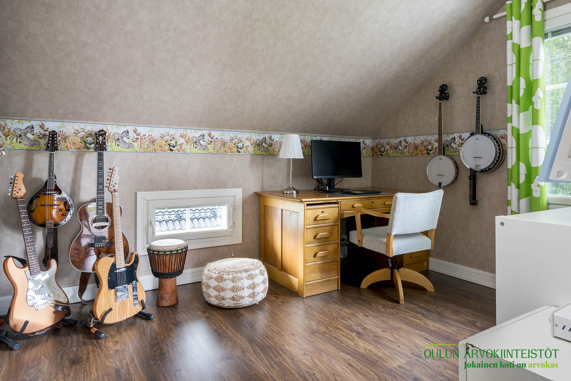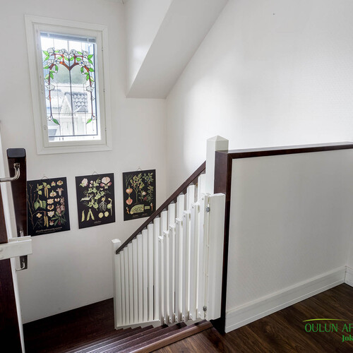 Lattia: laminaatti. Seinät: tapetti