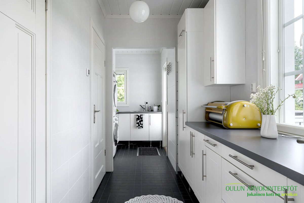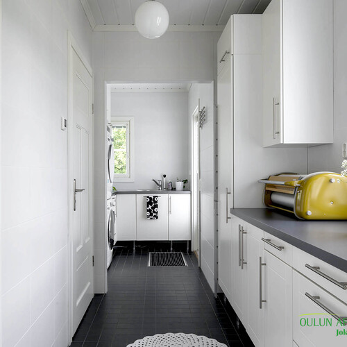Työtasot: laminaatti, kivi. Lattia: laatta. Seinät: tapetti.