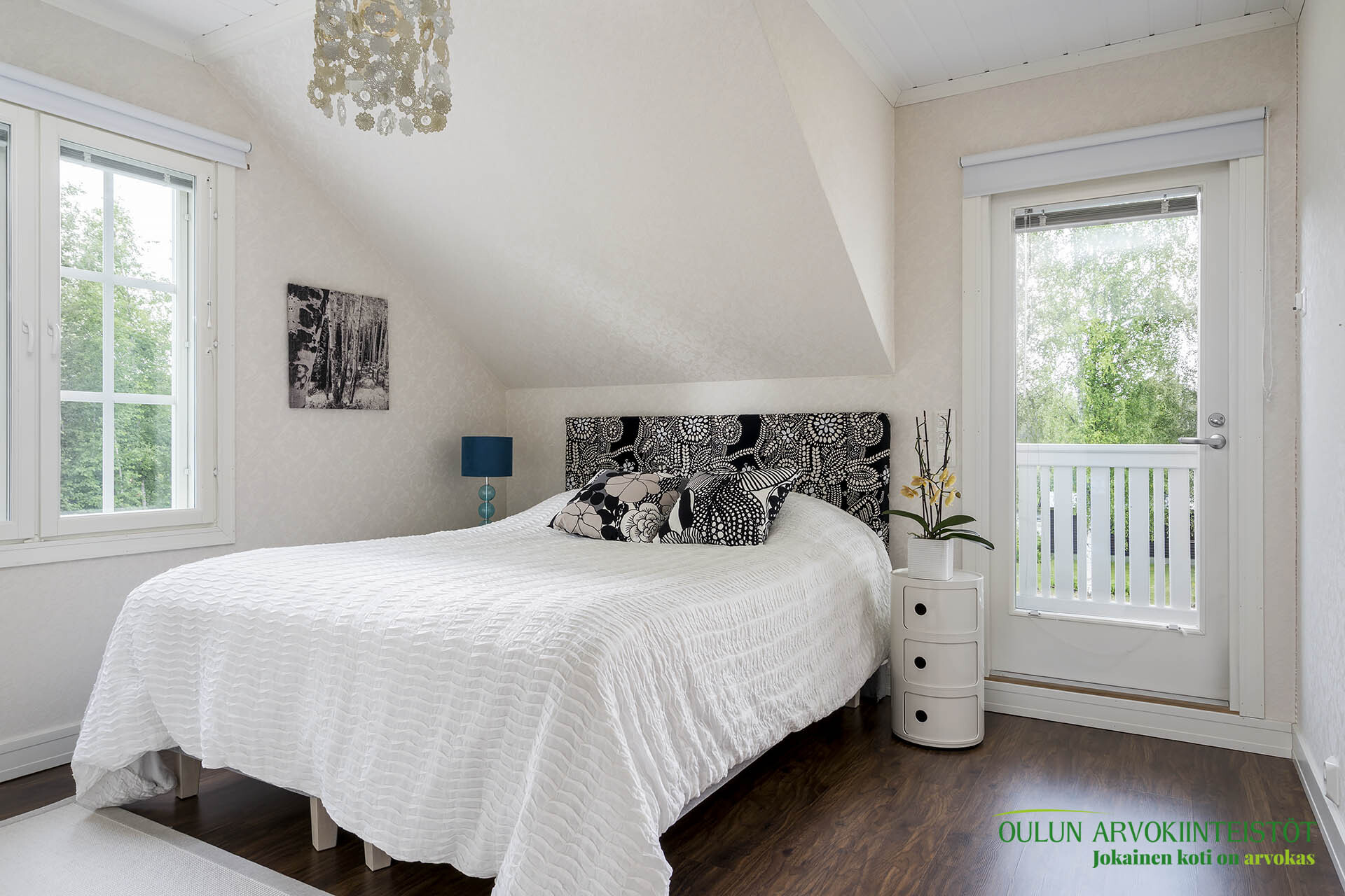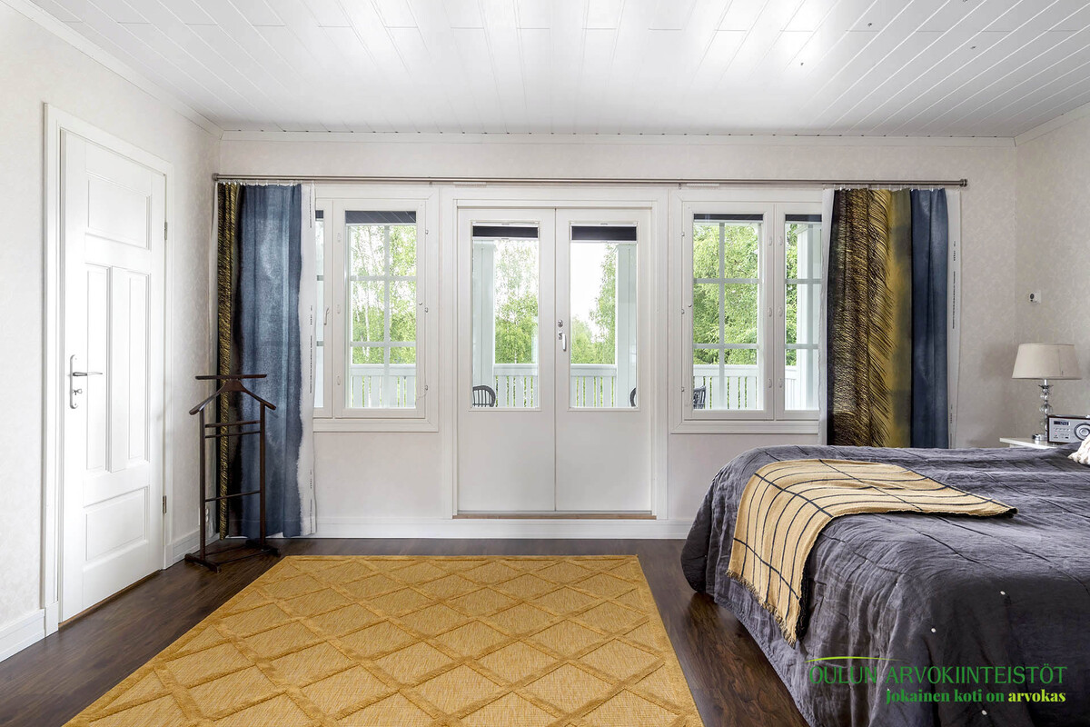 Suuremmalle, joen puolen parvekkeelle käynti kolmesta makuuhuoneesta.