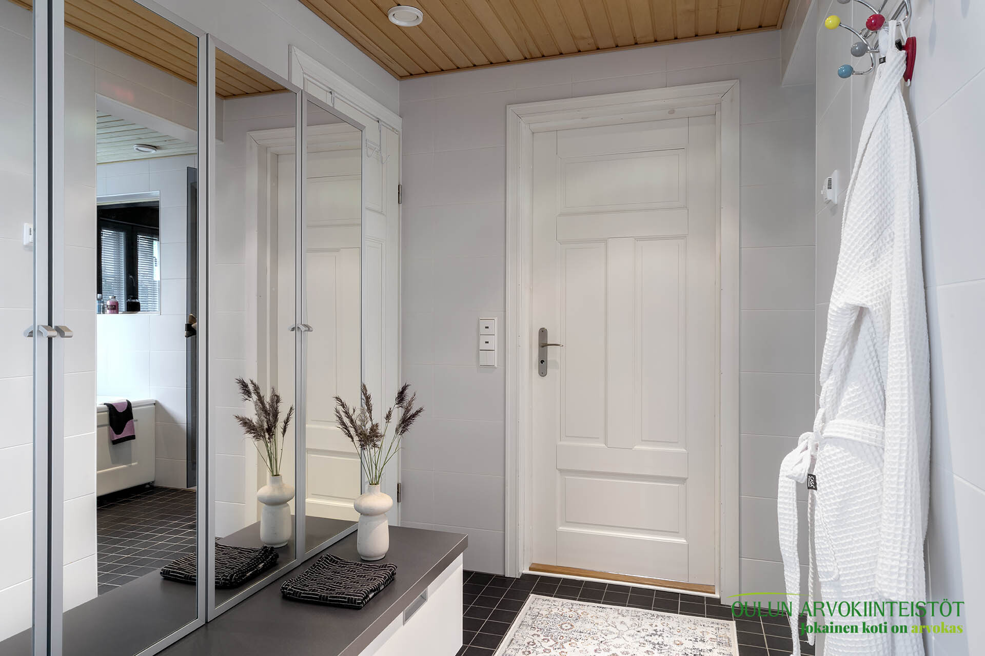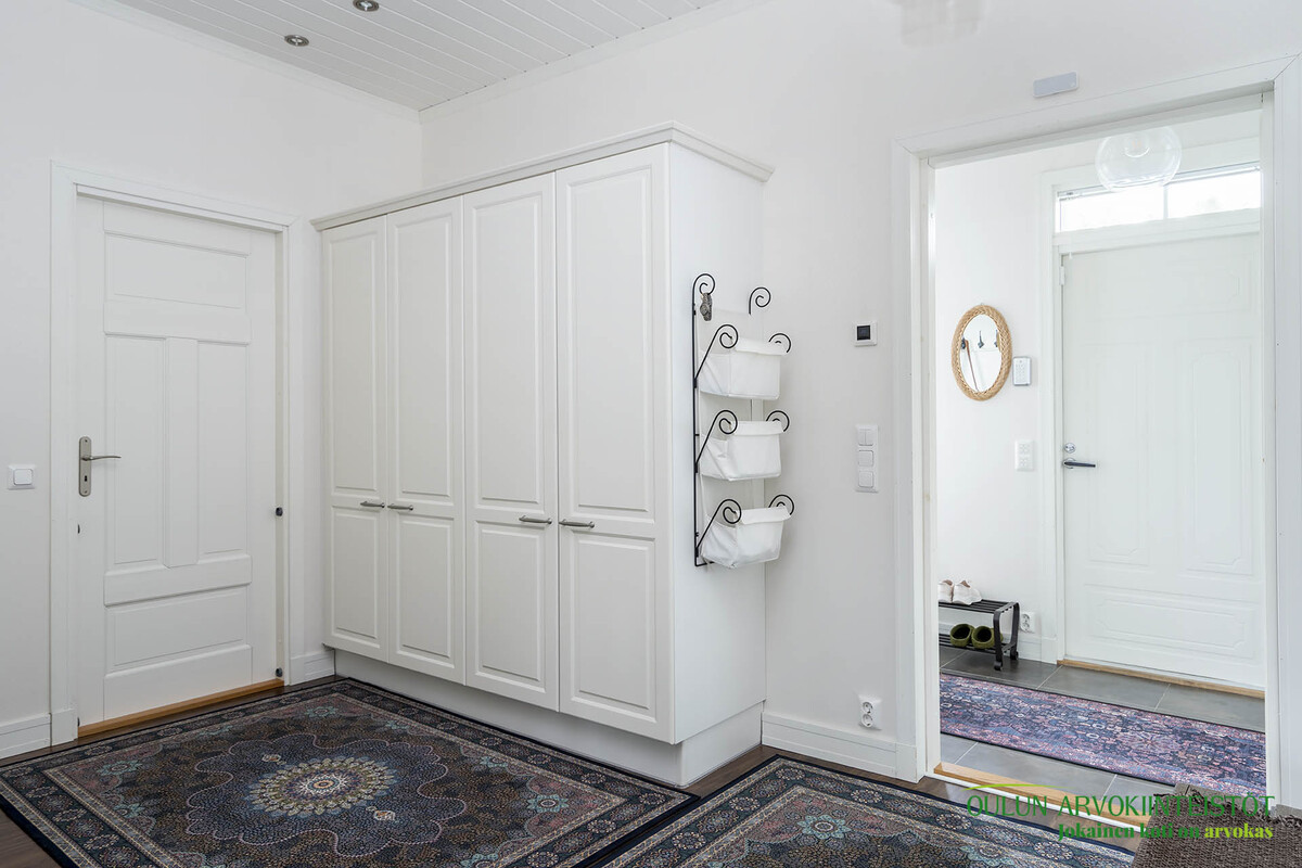 Tuulikaappi: Todella käytännöllinen arkieteinen sisäänkäynnin yhteydessä.