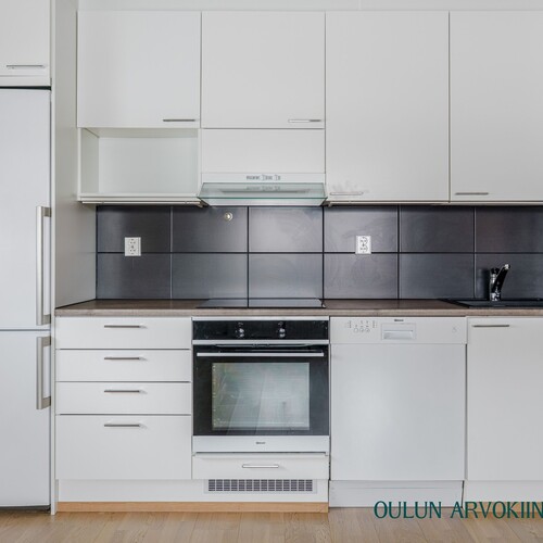 Varusteet: jääkaappipakastin, astianpesukone, liesituuletin hormilla, induktioliesi, erillisuuni