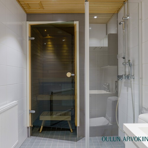 Toimiva kaunis tilava kylpyhuone. Harvian kiukaasta voit nauttia kunnon löylyistä.