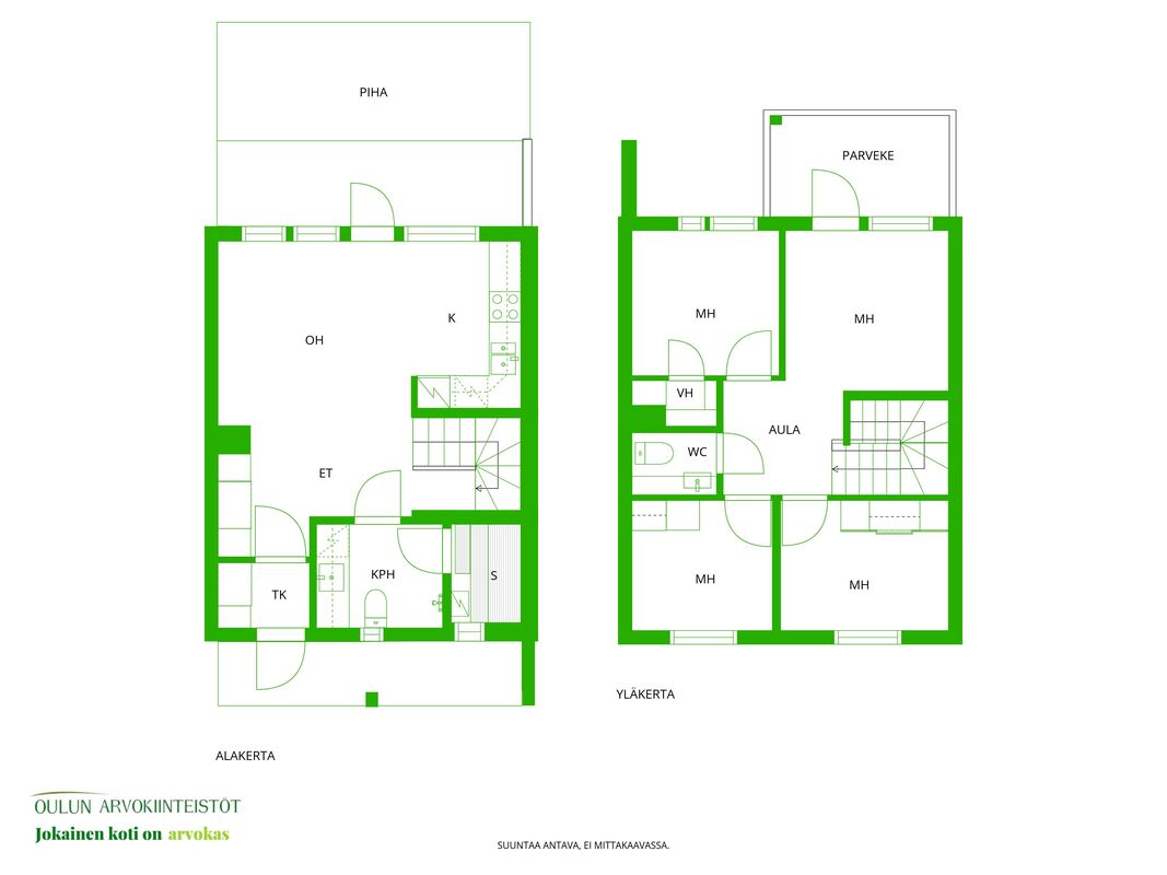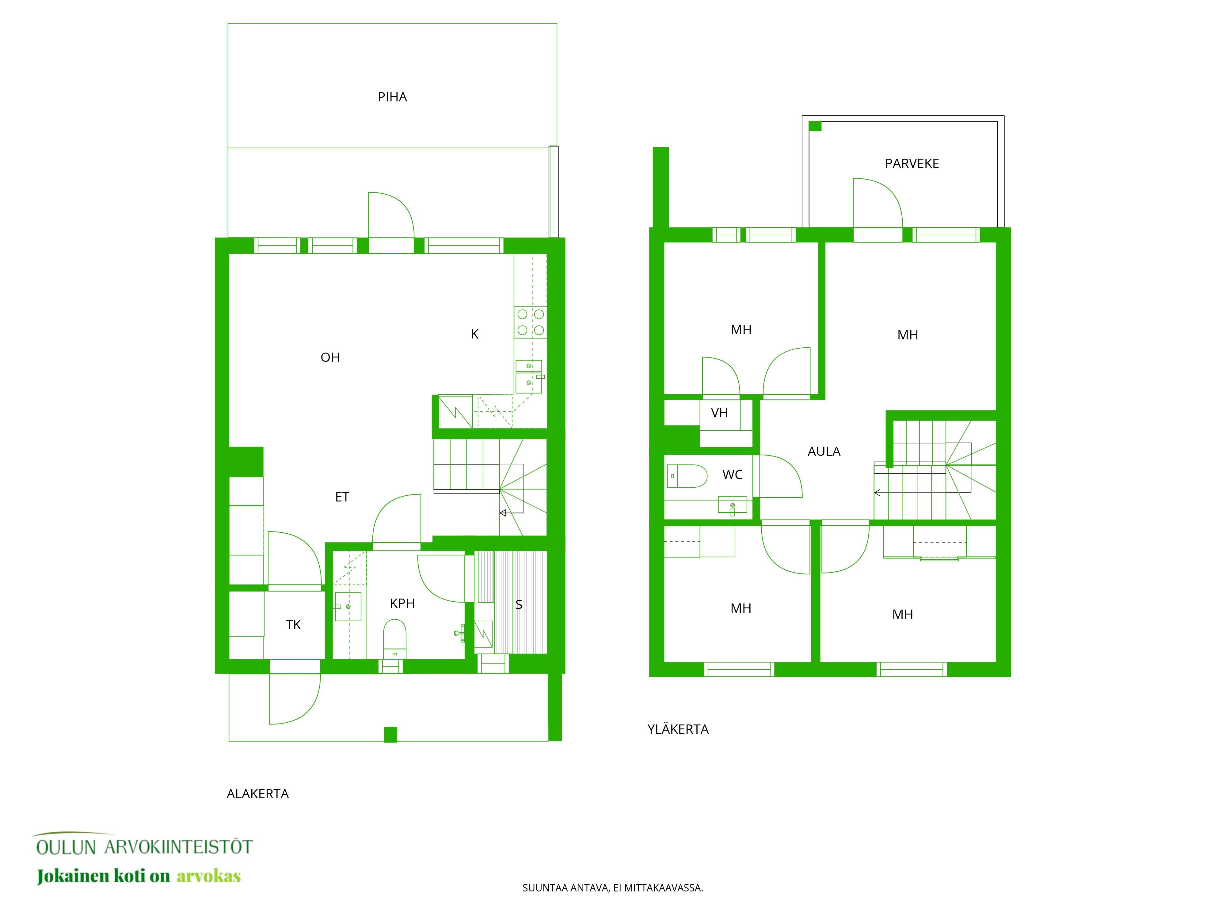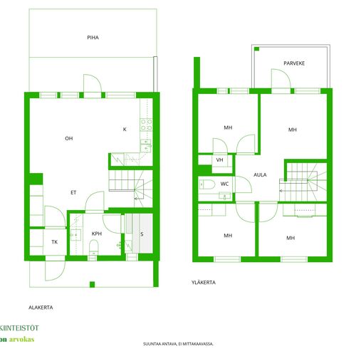 Alakerrassa oh, k,oh, s, kph,+ iso terassipatio ja yläkerrassa 4 mh ja wc sekä vaatehuone ja parveke.