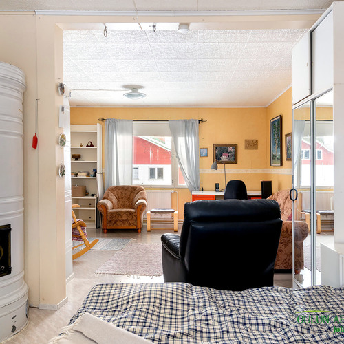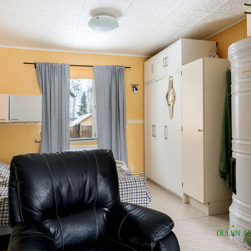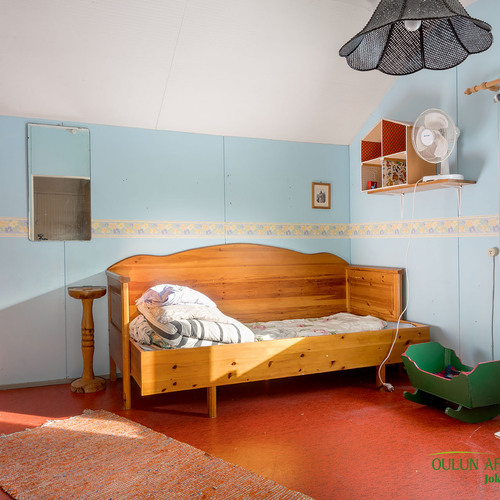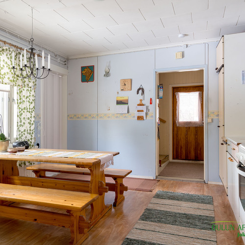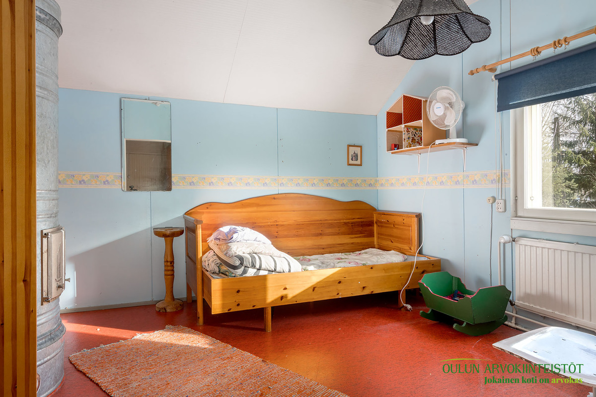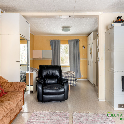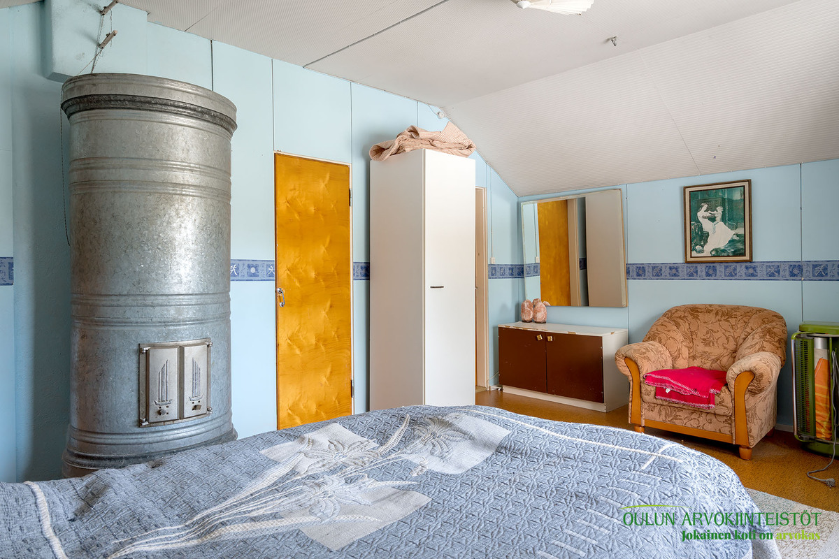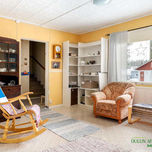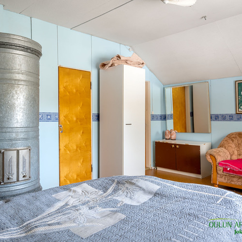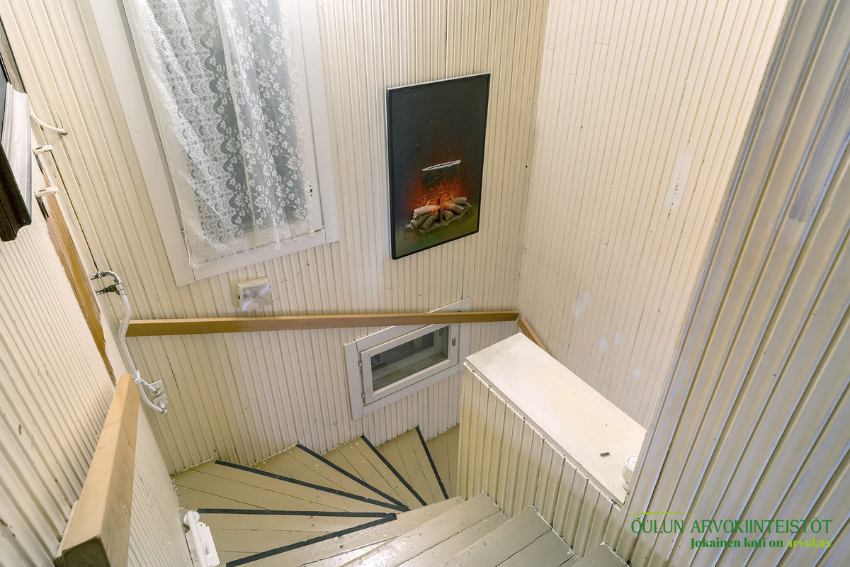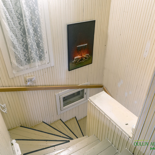 Kahdessa tasossa oleva sympaattinen koti kätkee alakerrassa toimivan keittiön, olohuoneen, kylpytilat, saunan ja huoneen mikä toimii hyvin makuuhuoneena josta löytyy ihana ja tunnelmaa tuova vanhanajan kakluuni ja olohuoneen puolella on myös lämpöä tuova näyttävä kakluuni.