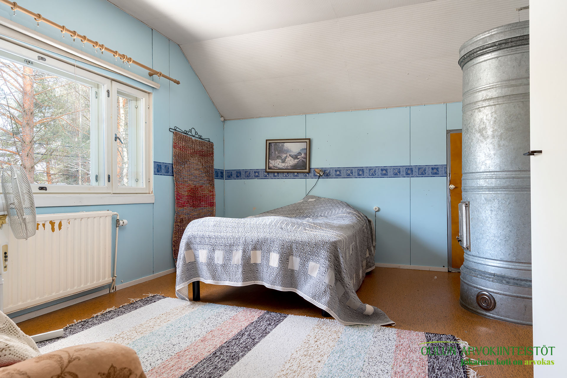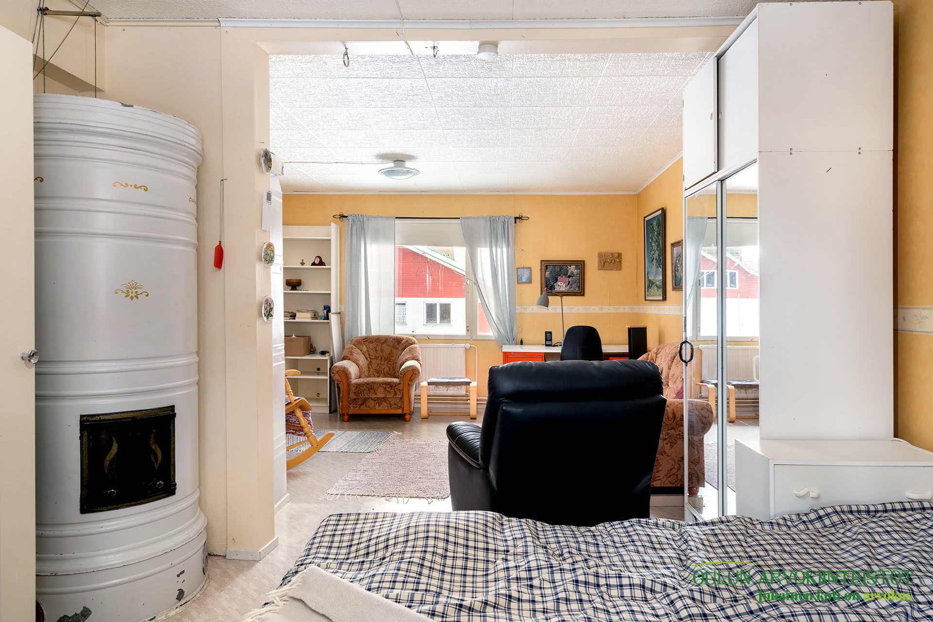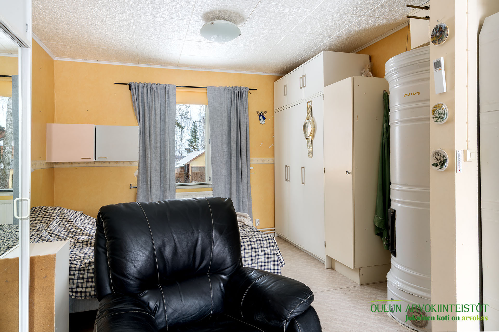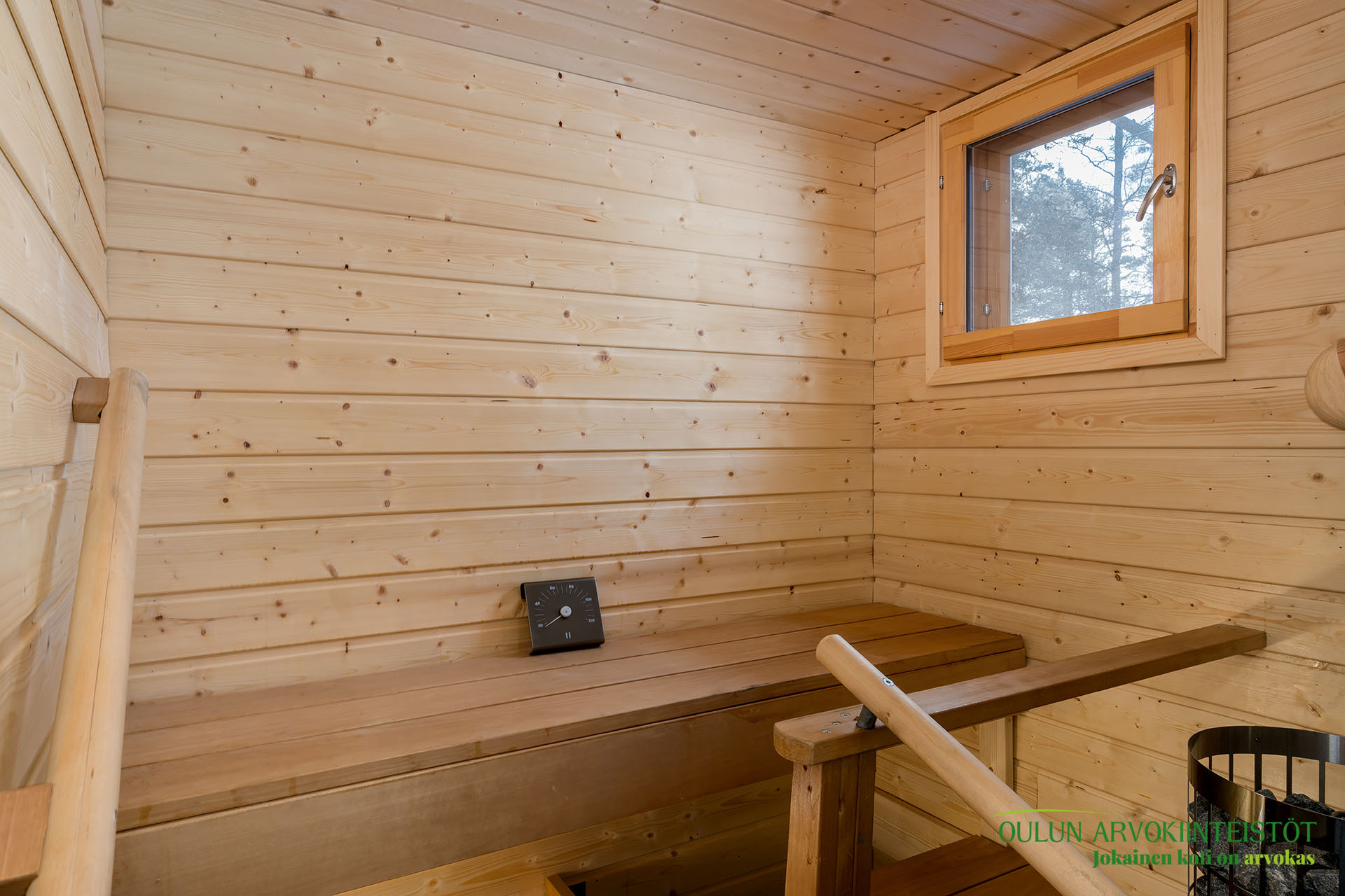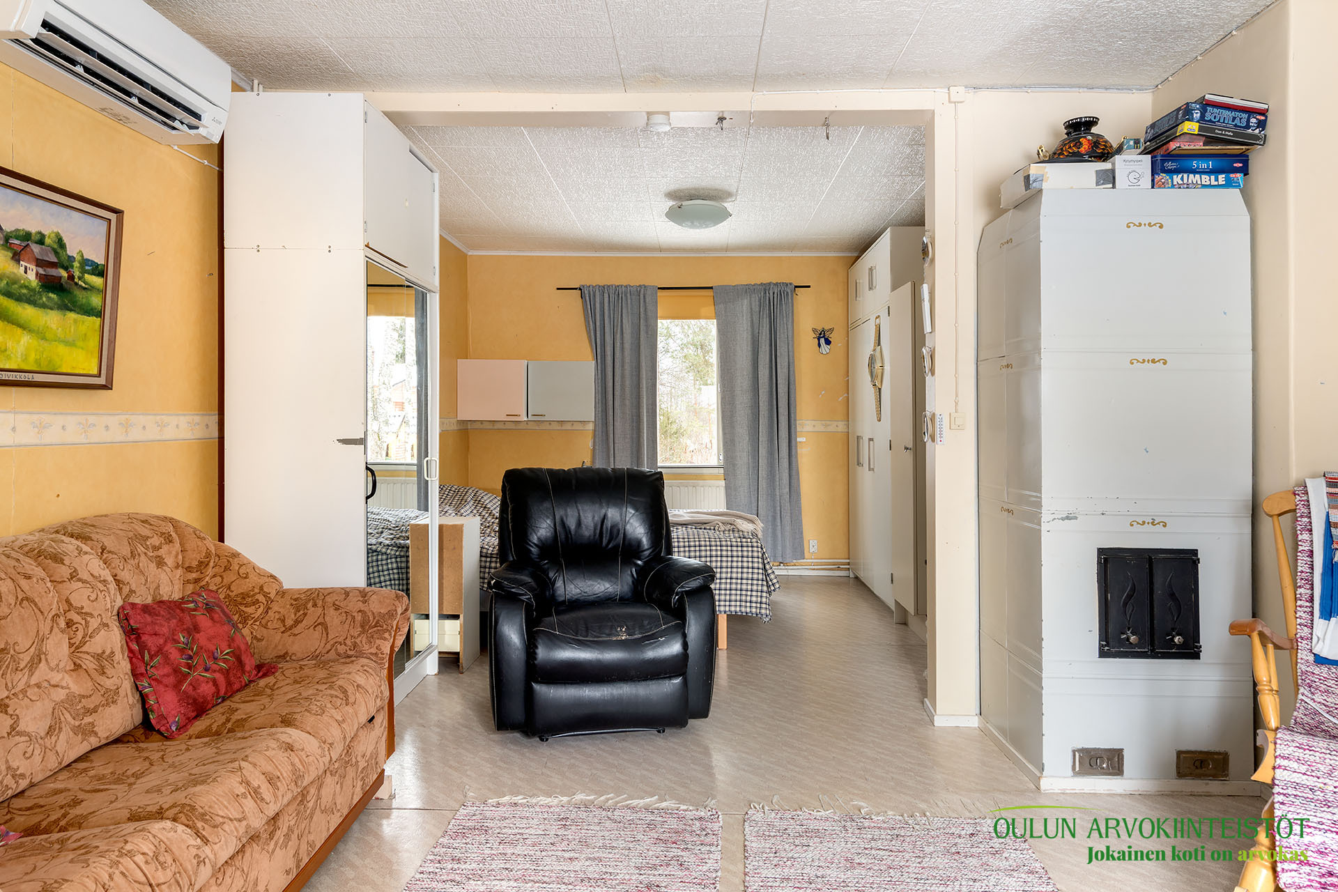 Kahdessa tasossa oleva sympaattinen koti kätkee alakerrassa toimivan keittiön, olohuoneen, kylpytilat, saunan ja huoneen mikä toimii hyvin makuuhuoneena josta löytyy ihana ja tunnelmaa tuova vanhanajan kakluuni ja olohuoneen puolella on myös lämpöä tuova näyttävä kakluuni.