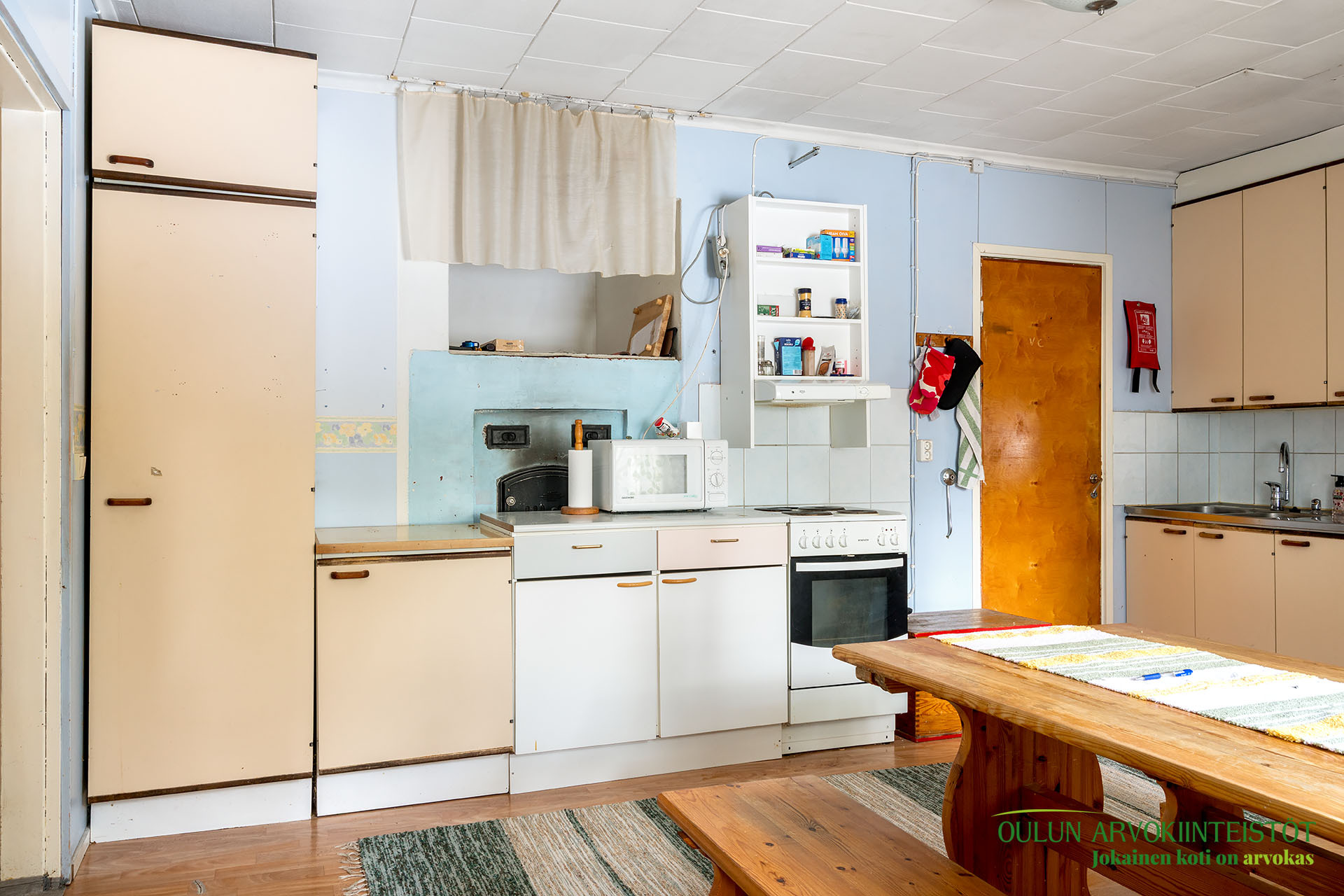 Keittiössä on kaapistoja, perusvarusteet ja sähköhella. Lisäksi pirtissä on hyvän kokoinen leivinuuni.