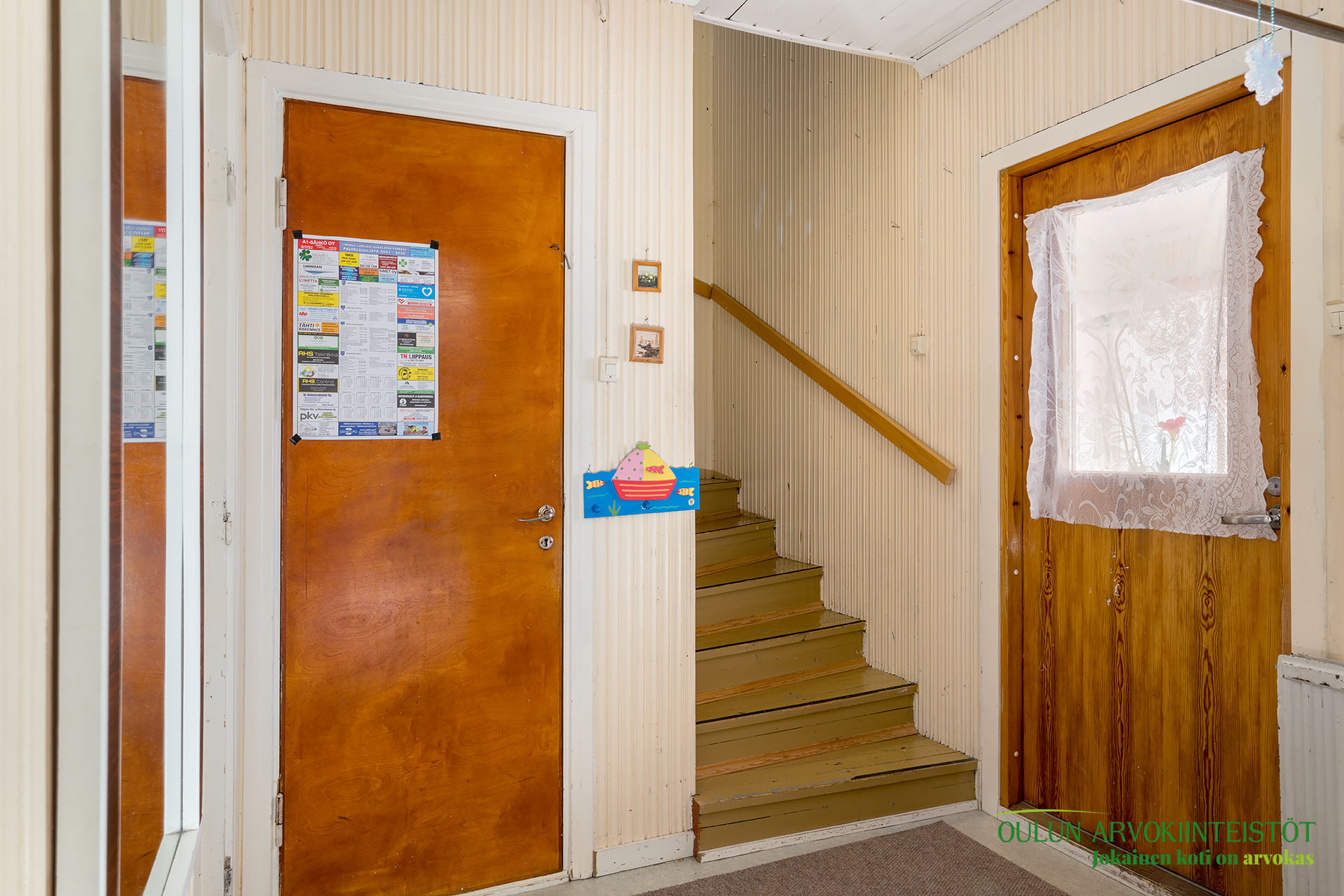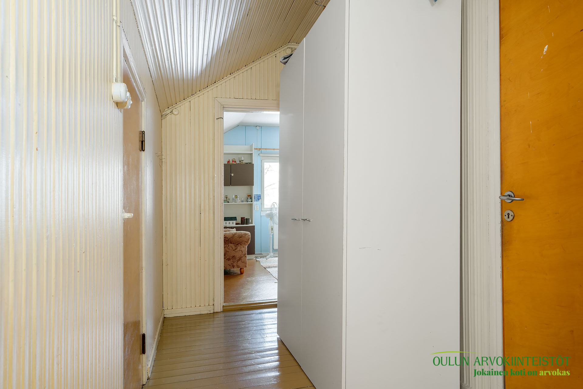 Eteisen tuulikaappi on tilankäytön kannalta erittäin käytännöllinen ja johtaa sisääntulijan eteiskäytävää pitkin keittiöön ja olohuoneeseen. Alakerrassa myös erillinen wc.