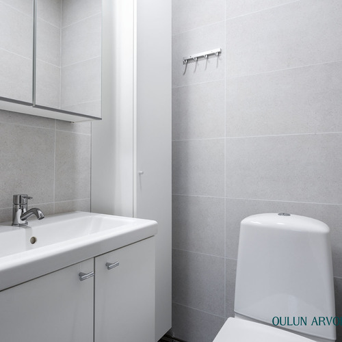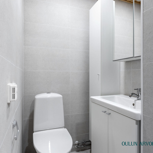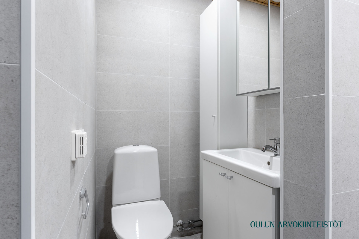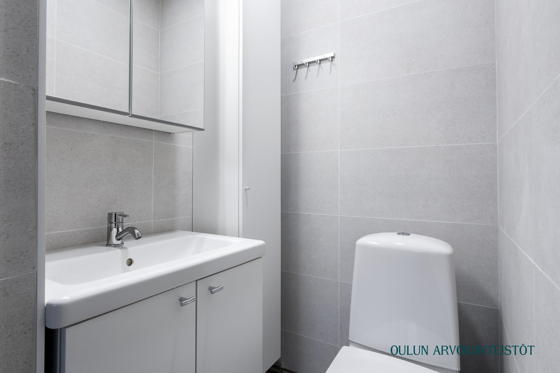WC-tila 2: Varusteet: lattiaan asennettu WC, allaskaappi, peilikaappi