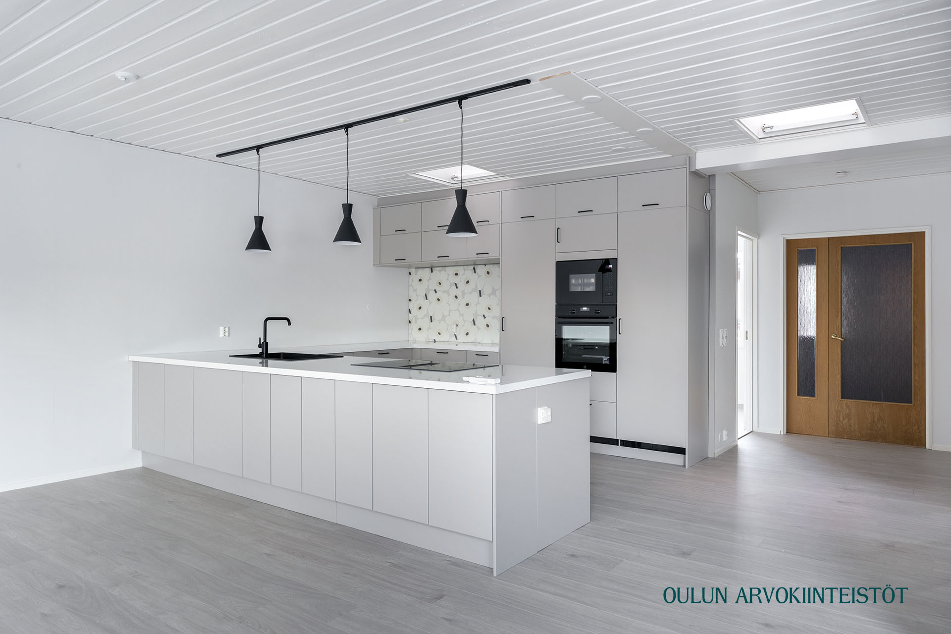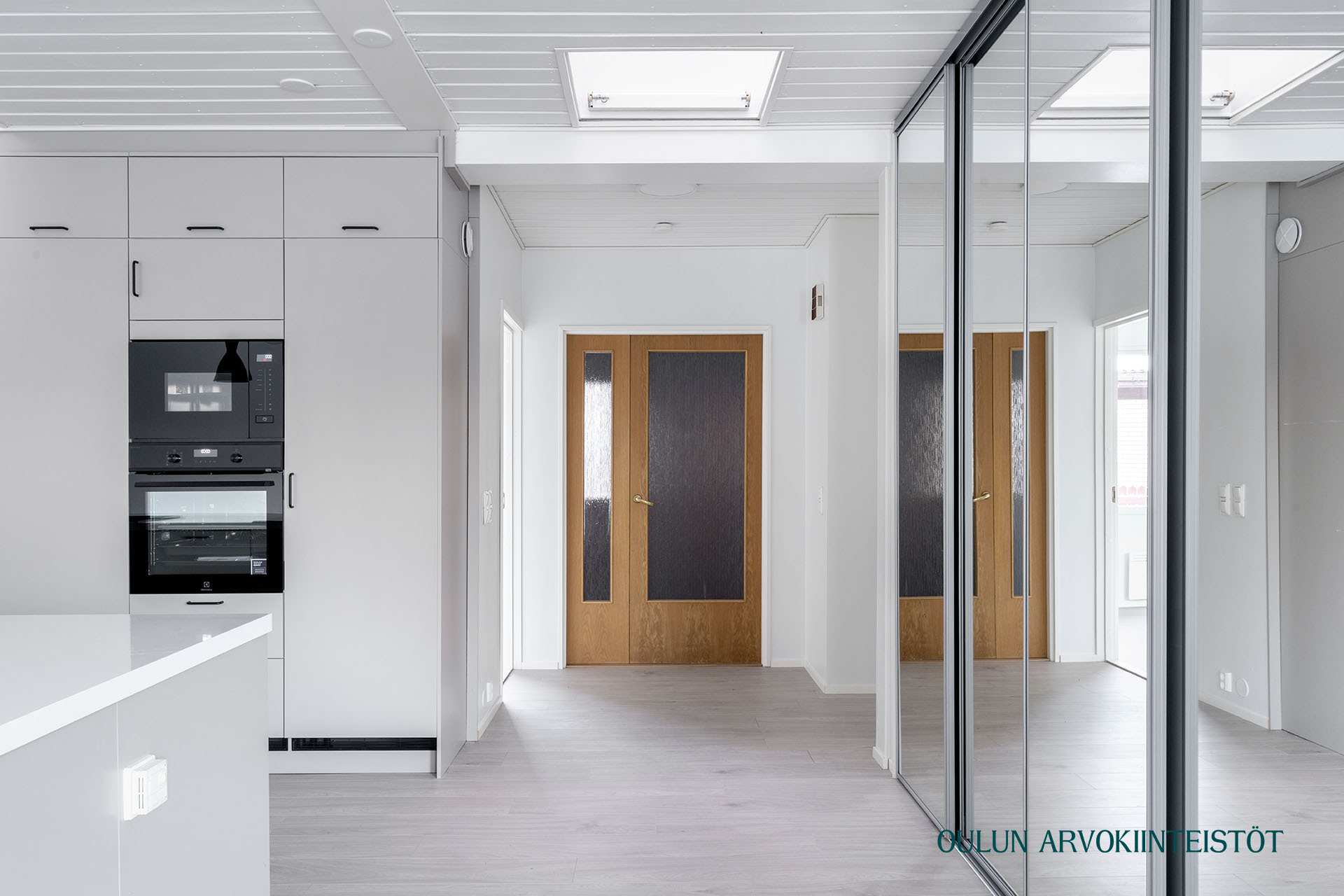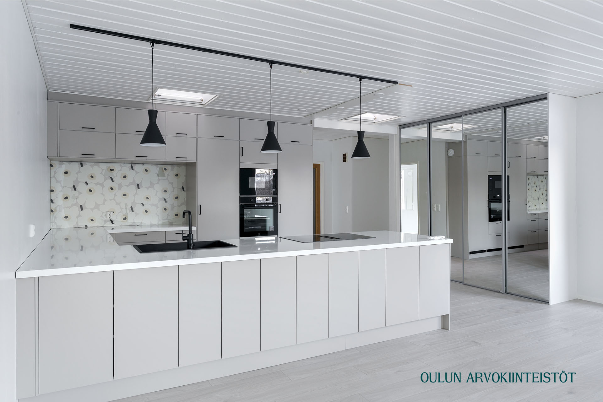 Keittiö on uudistettu kokonaan ja se on varustettu laadukkailla Epoqin kaapistoilla, moderneilla kodinkoneilla sekä huolella viimeistellyillä yksityiskohdilla. Olohuoneen ja takkahuoneen välistä kulkuaukkoa on laajennettu, mikä lisää tilan tuntua ja tekee kokonaisuudesta yhtenäisen. Tunnelmallinen takkahuone on erinomainen lisä kokonaisuuteen.