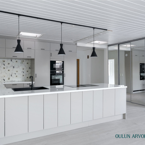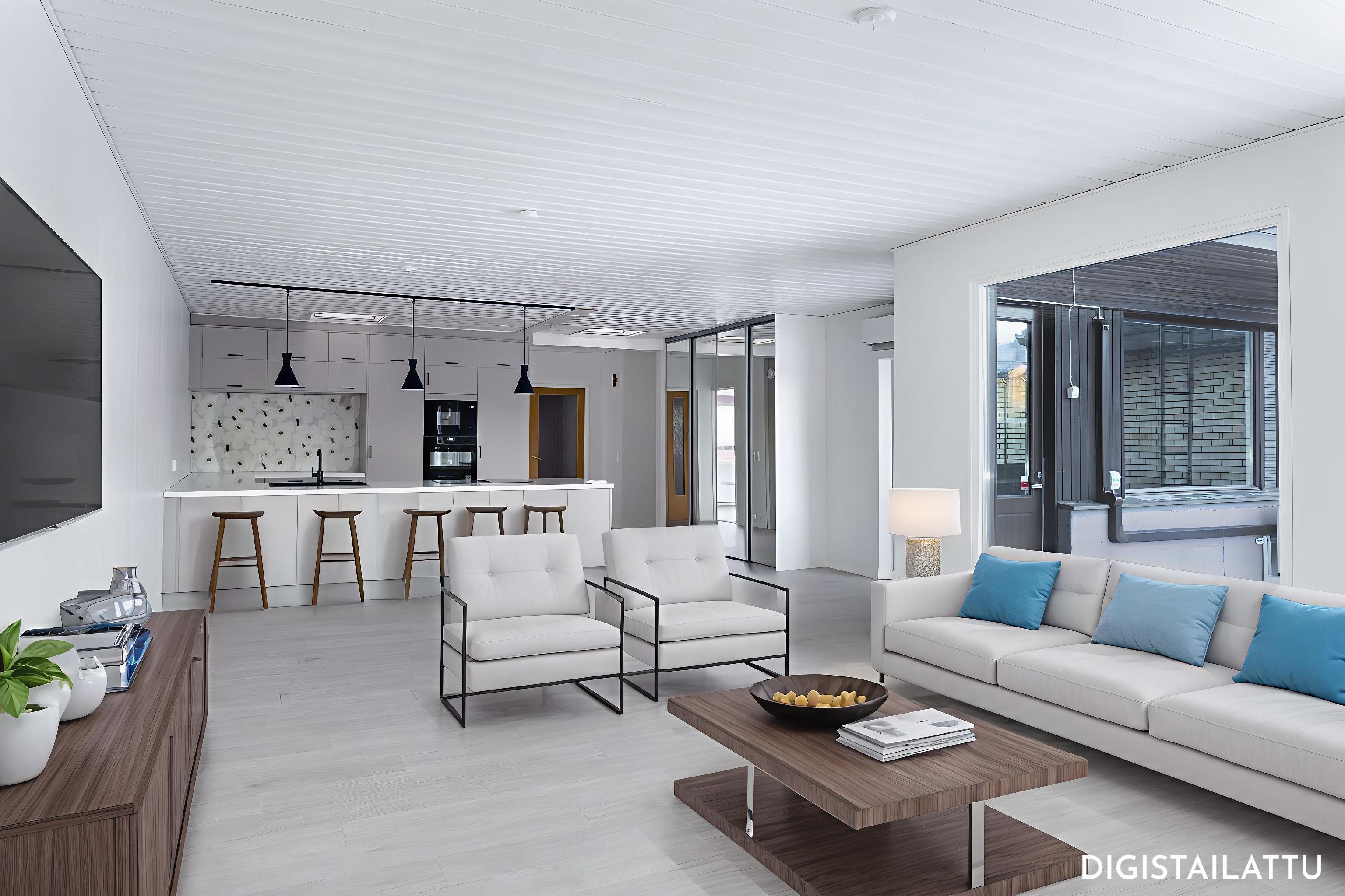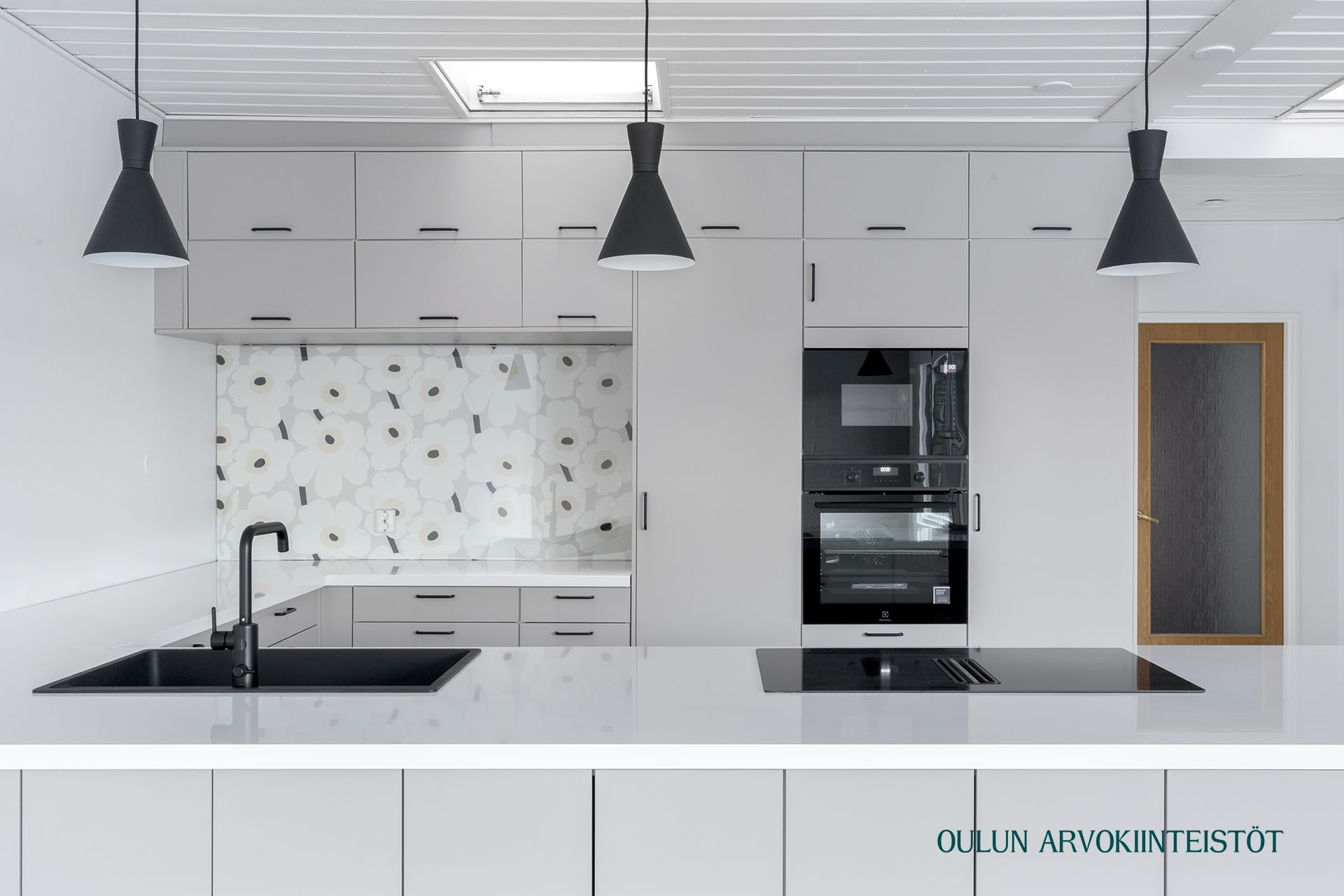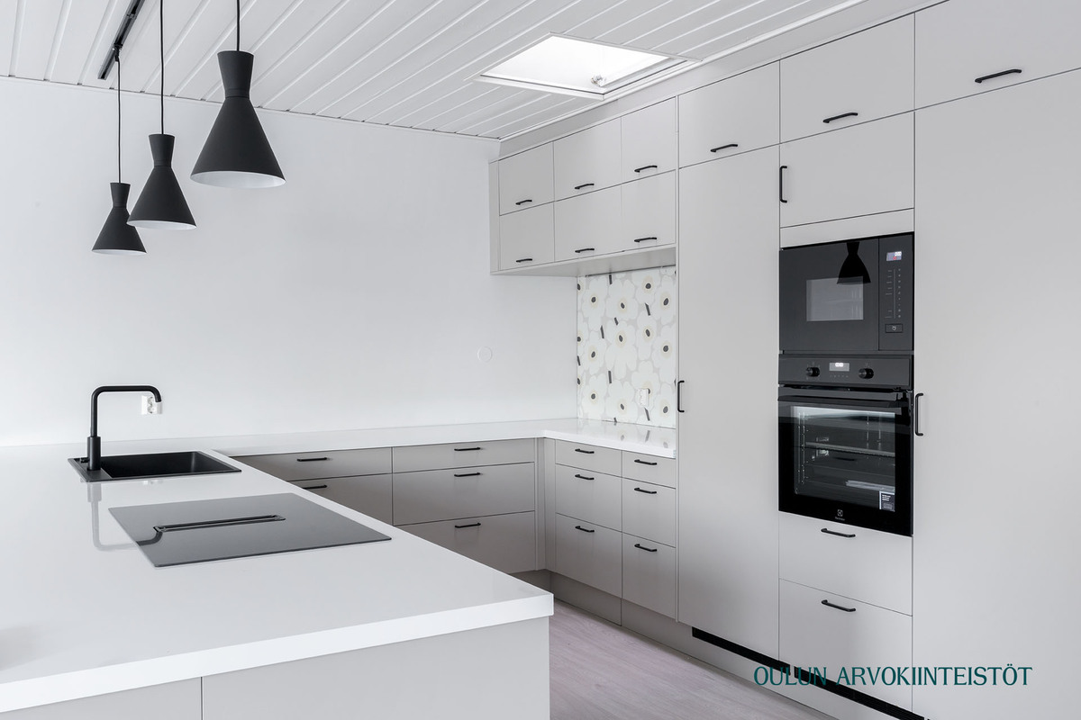 Keittiö on uudistettu kokonaan ja se on varustettu laadukkailla Epoqin kaapistoilla, moderneilla kodinkoneilla sekä huolella viimeistellyillä yksityiskohdilla. Olohuoneen ja takkahuoneen välistä kulkuaukkoa on laajennettu, mikä lisää tilan tuntua ja tekee kokonaisuudesta yhtenäisen. Tunnelmallinen takkahuone on erinomainen lisä kokonaisuuteen.