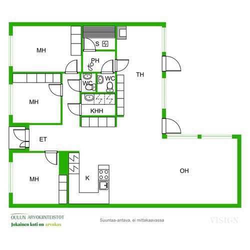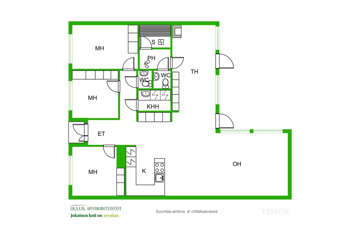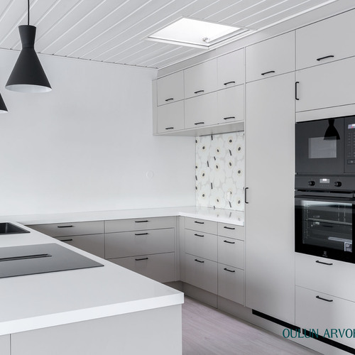 Varusteet: jääkaappi, pakastin, astianpesukone, astianpesukoneliitäntä, integroidut kodinkoneet, mikroaaltouuni, integroitu liesi