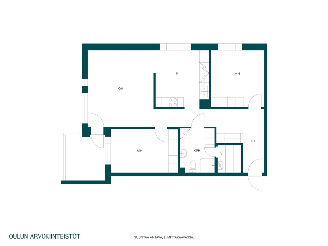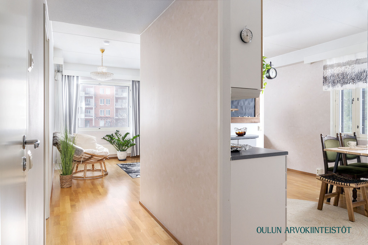 Asunnon pohjaratkaisu on selkeä ja toimiva. Kaksi tilavaa makuuhuonetta, jotka sijaitsevat asunnon eri puolilla. Tämä lisää asumismukavuutta ja yksityisyyttä. Erillinen keittiö, viihtyisä olohuone sekä kylpyhuone ja oma sauna tuomaan arjen luksusta. Kodin kokonaisuus on valoisa ja helposti sisustettava.