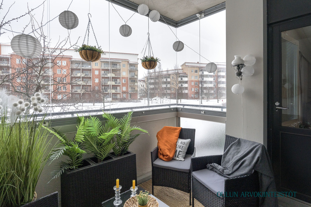 Lasitettu parveke avautuu upeisiin puistonäkymiin, mikä tekee siitä täydellisen paikan nauttia aamukahvista tai rentoutua iltaisin. Päätyasunnon sijainti tuo lisärauhaa ja tekee arjesta entistä miellyttävämpää.
