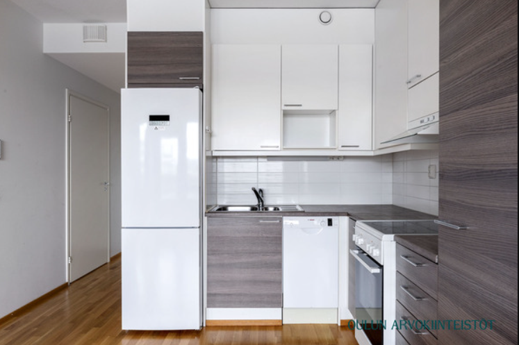 Keittiöstä löytyy jääkaappi/pakastin, sähköliesi, liesituuletin, astianpesukone ja laminaattiset työtasot.