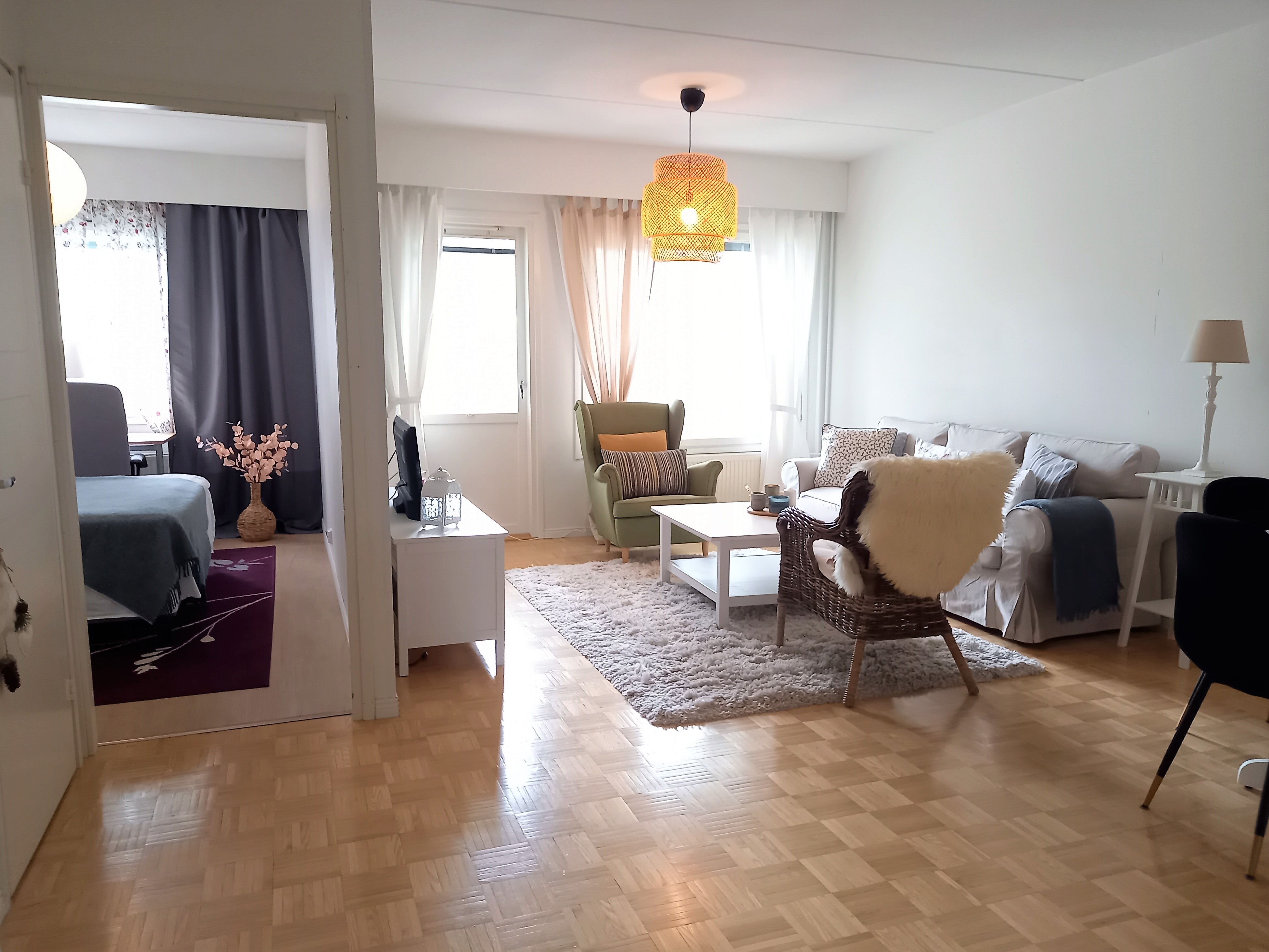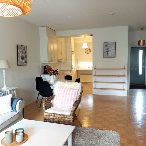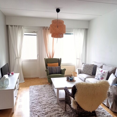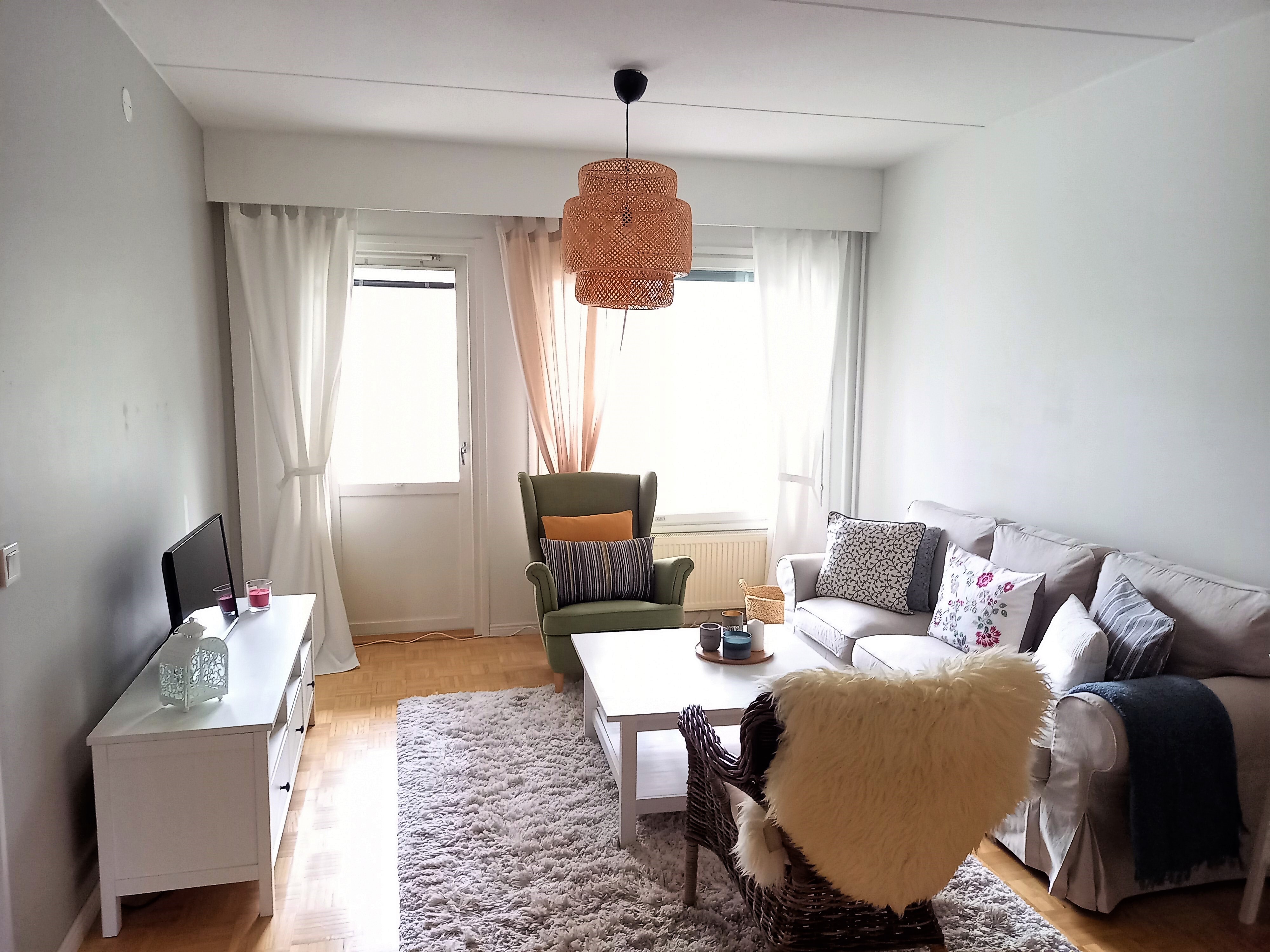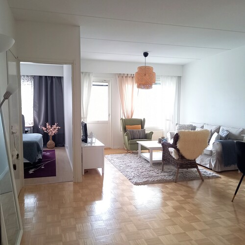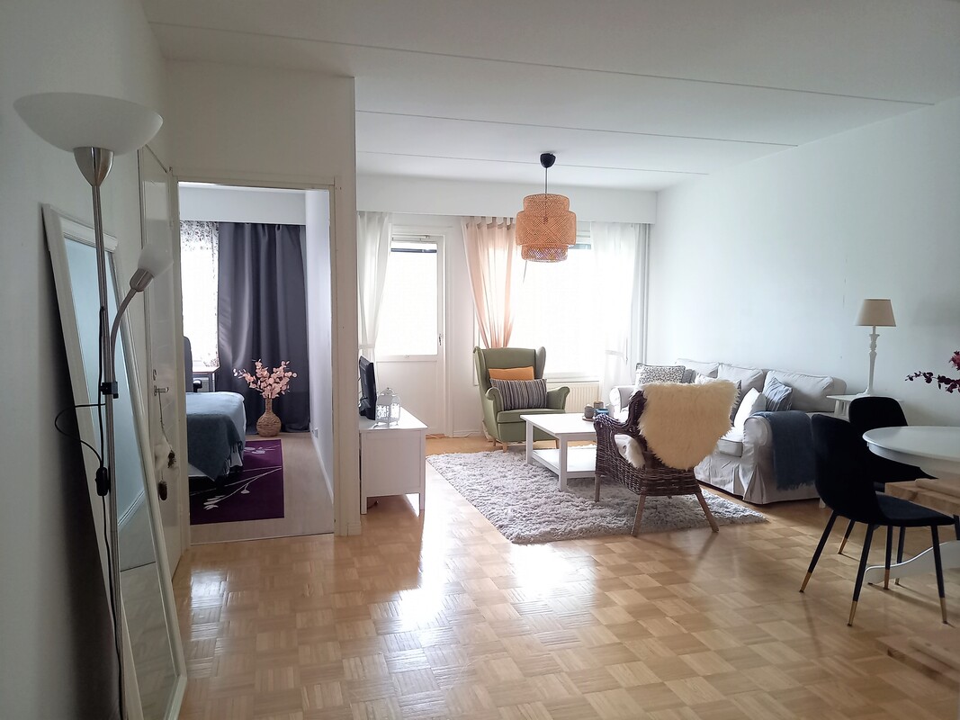 Asunto sijaitsee toisessa kerroksessa. Iso olohuone, josta käynti lasitetulle parvekkeelle.