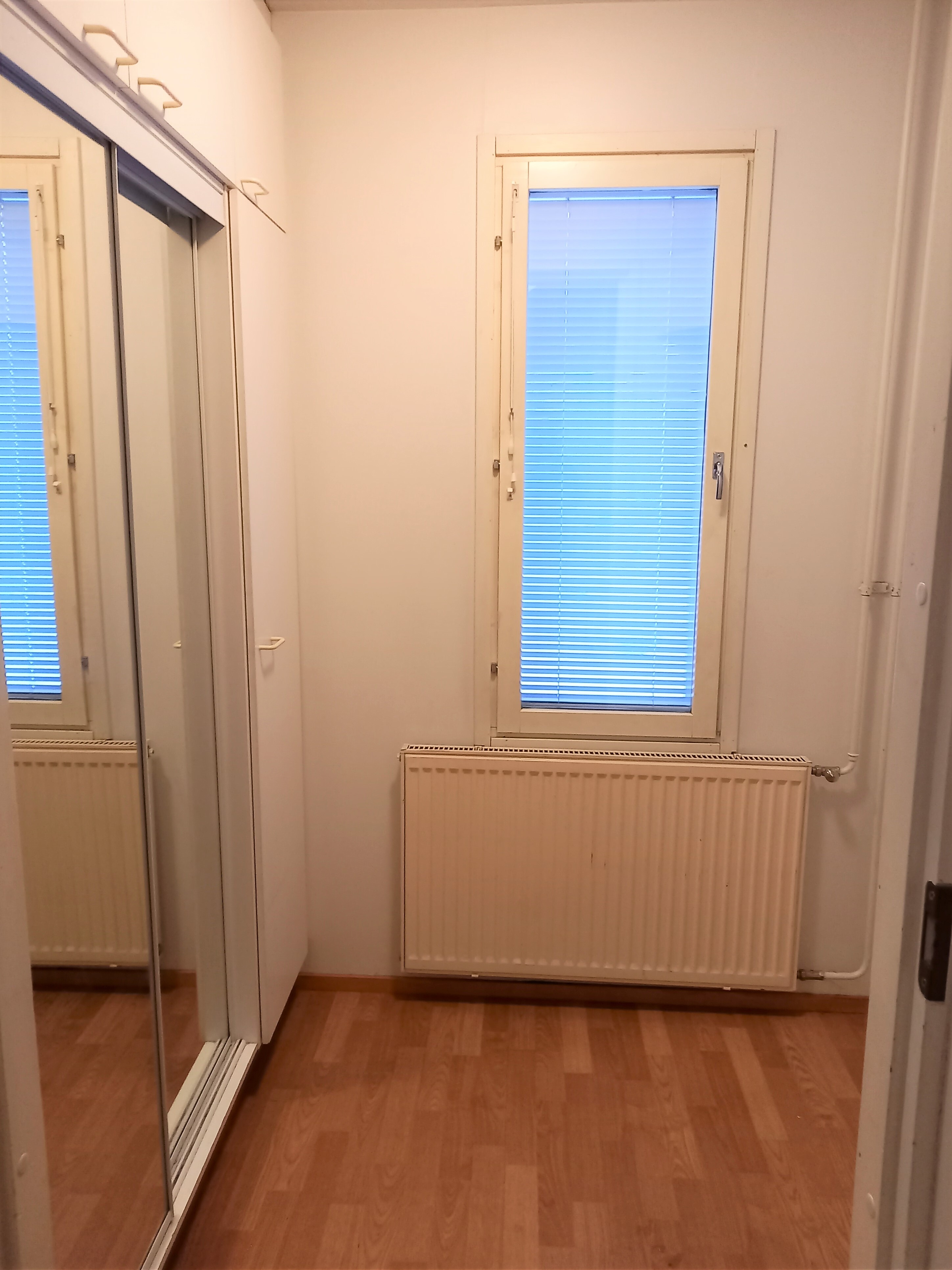 Omalla sisäänkäynnillä oleva asunto on pohjaratkaisultaan mainio. Olohuoneesta käynti parvekkeelle, josta näkymät sisäpihalle.